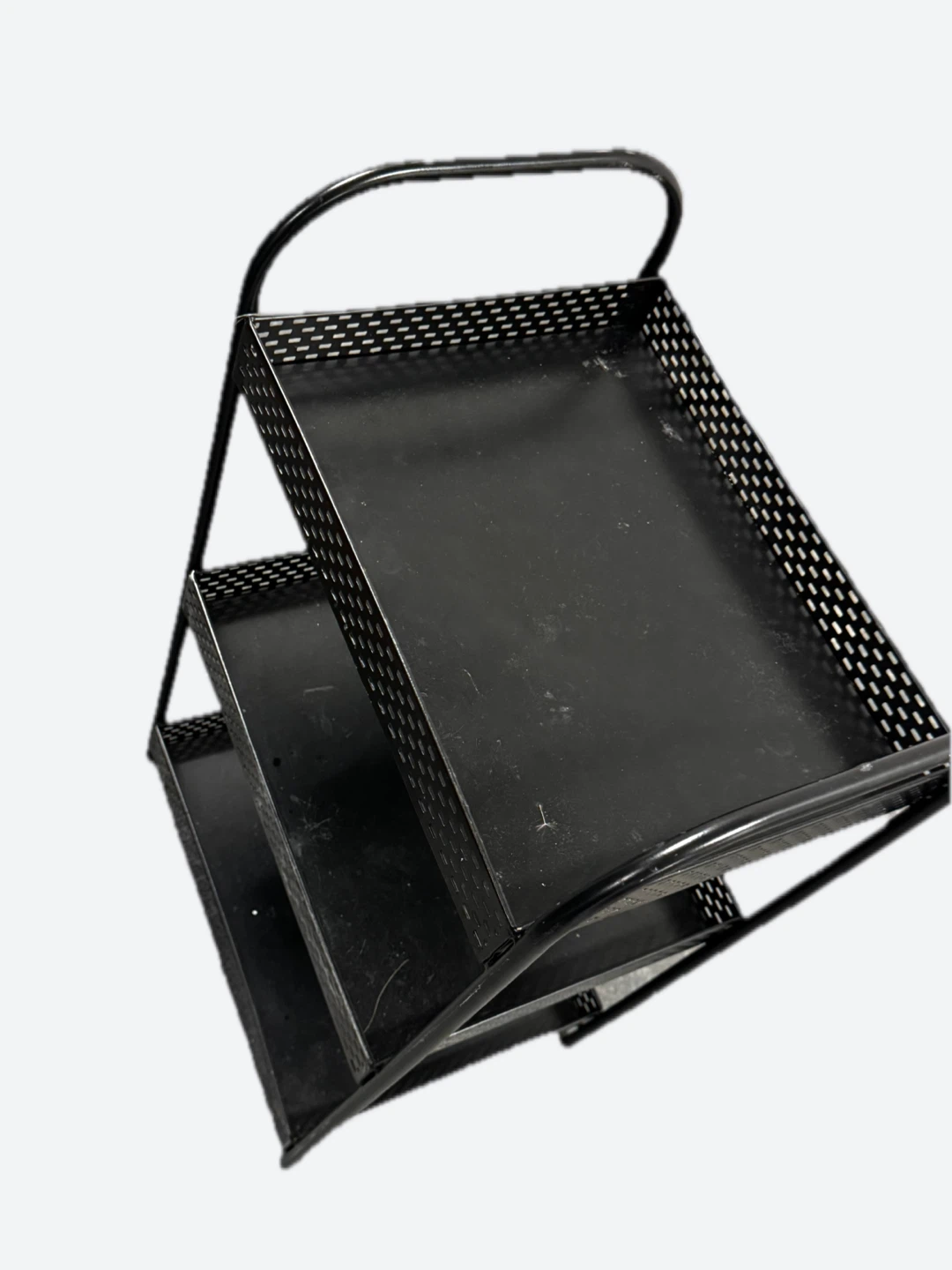 A black three-tier metal shelf organizer. The shelves are perforated for drainage. This organizer is useful for storing small items like toiletries or craft supplies.