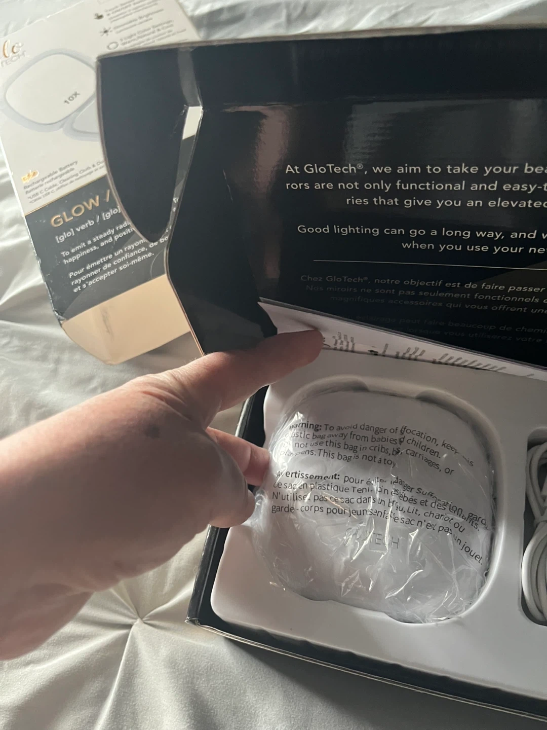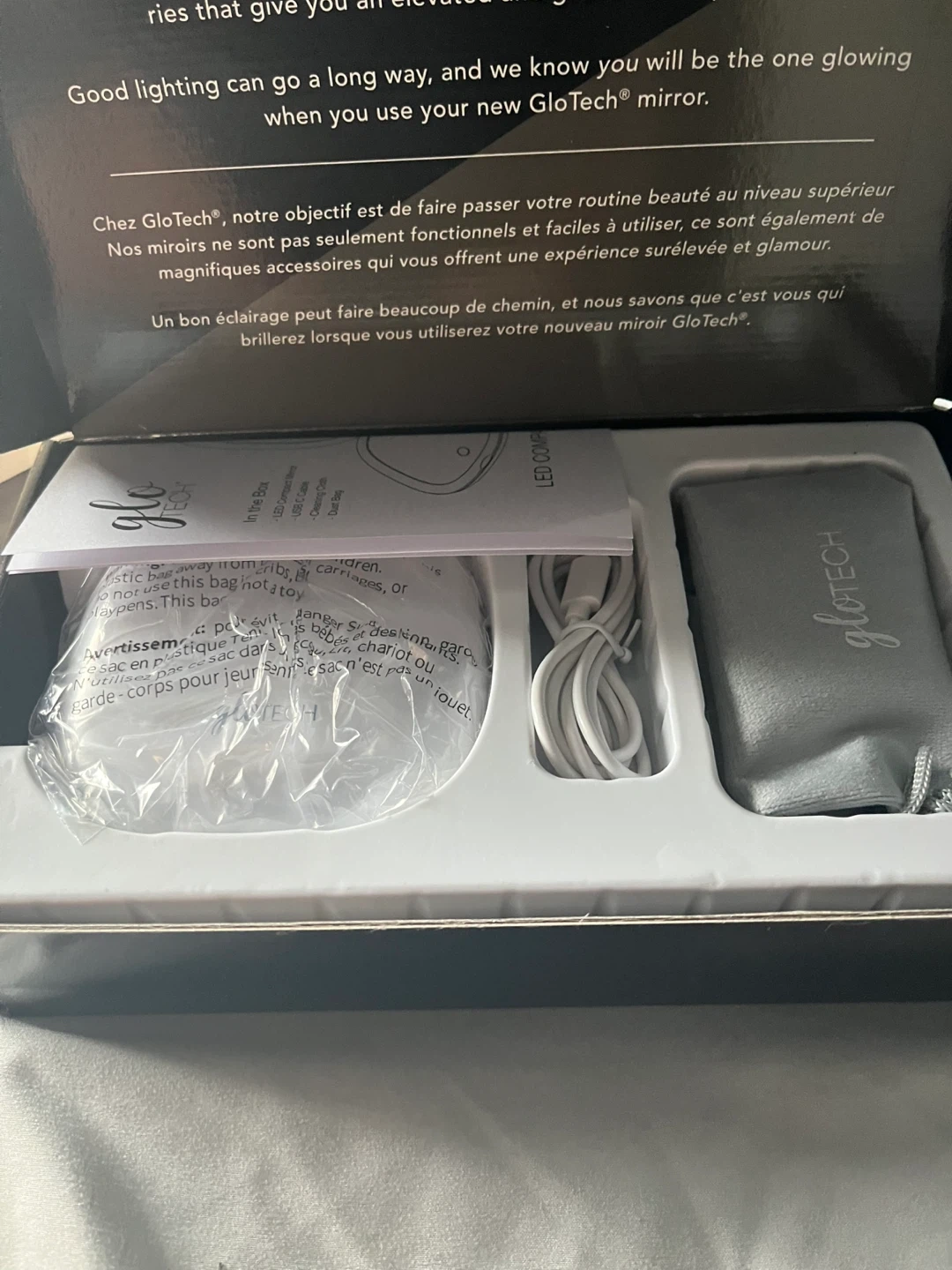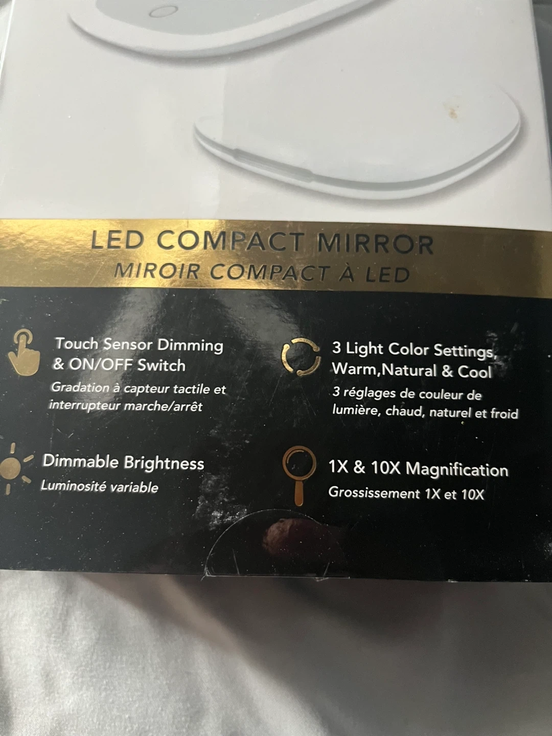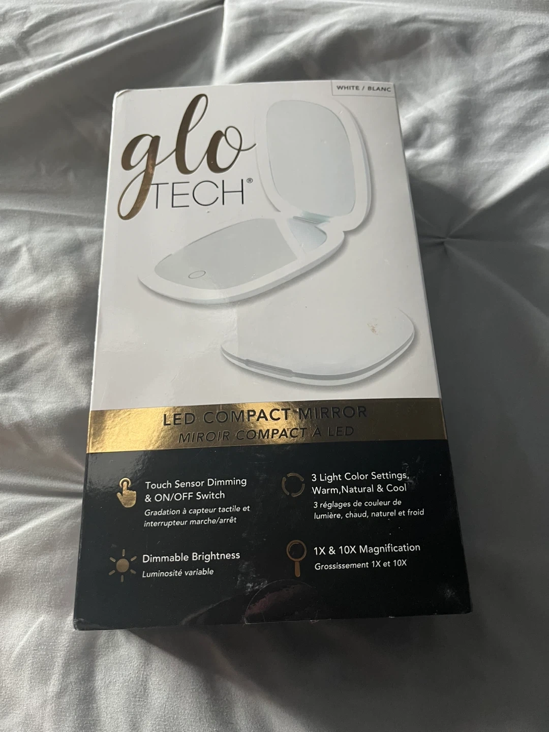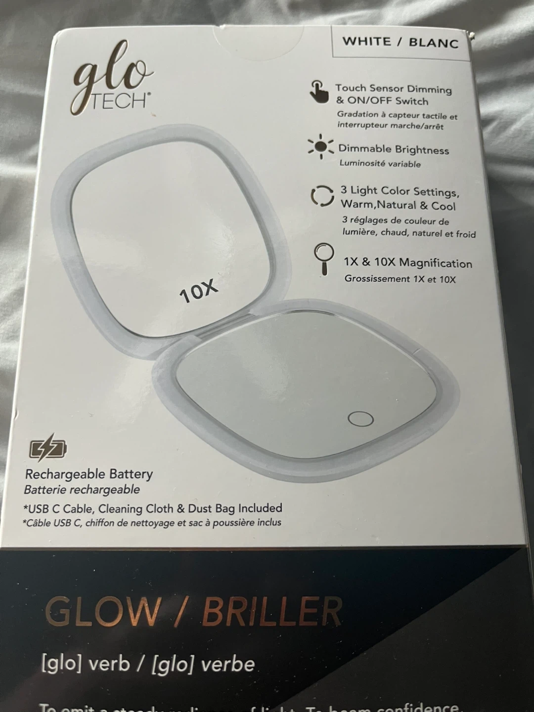 This Glo Tech LED Compact Mirror offers touch sensor dimming with 3 light color settings: warm, natural, and cool. It provides 1X and 10X magnification and features a rechargeable battery. Includes a USB C cable, cleaning cloth, and dust bag.