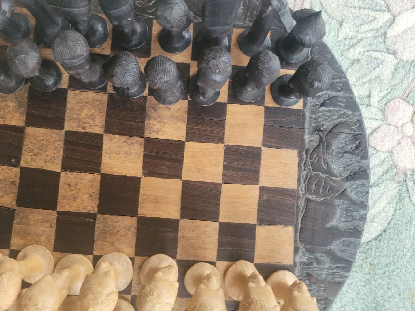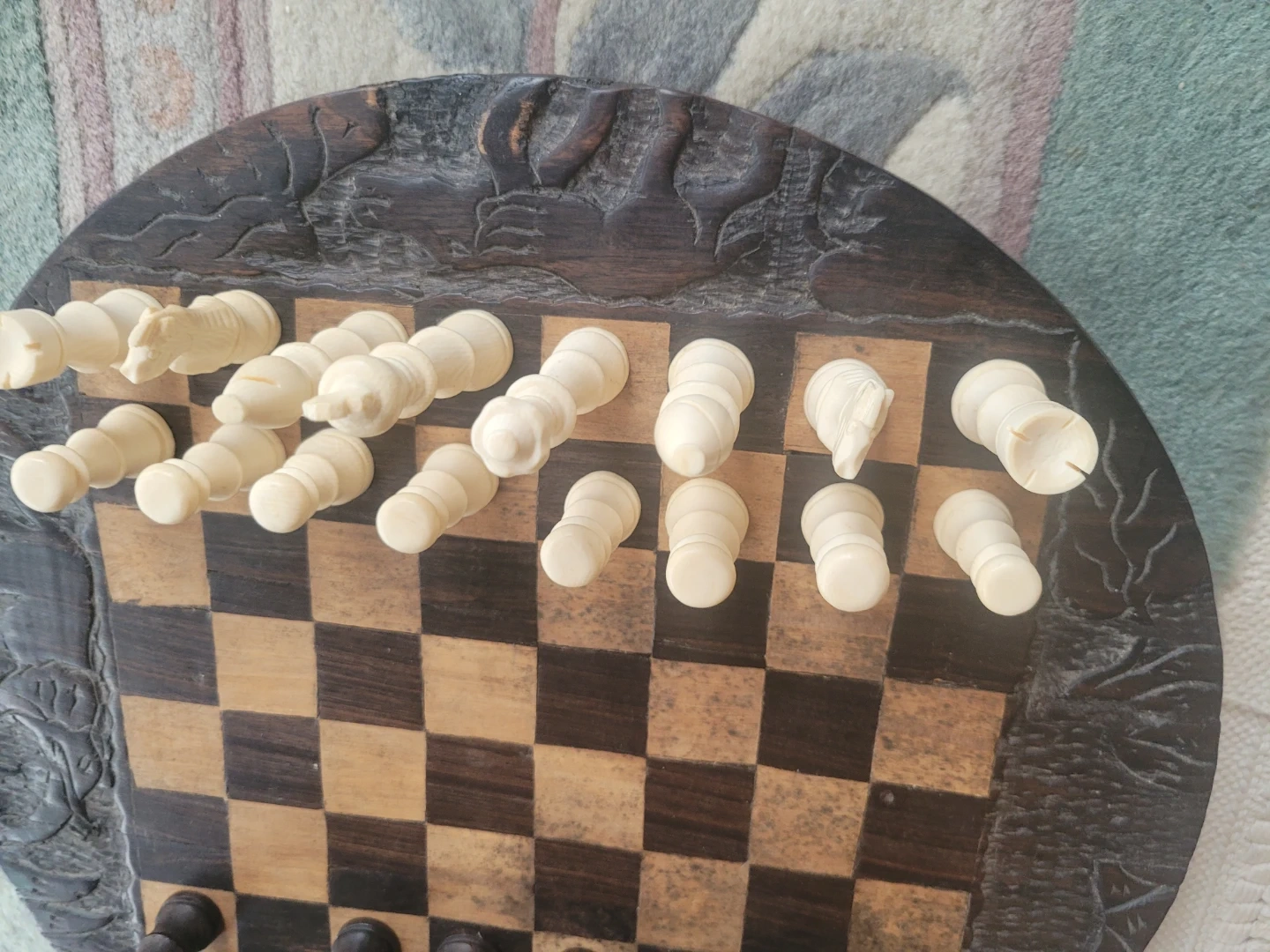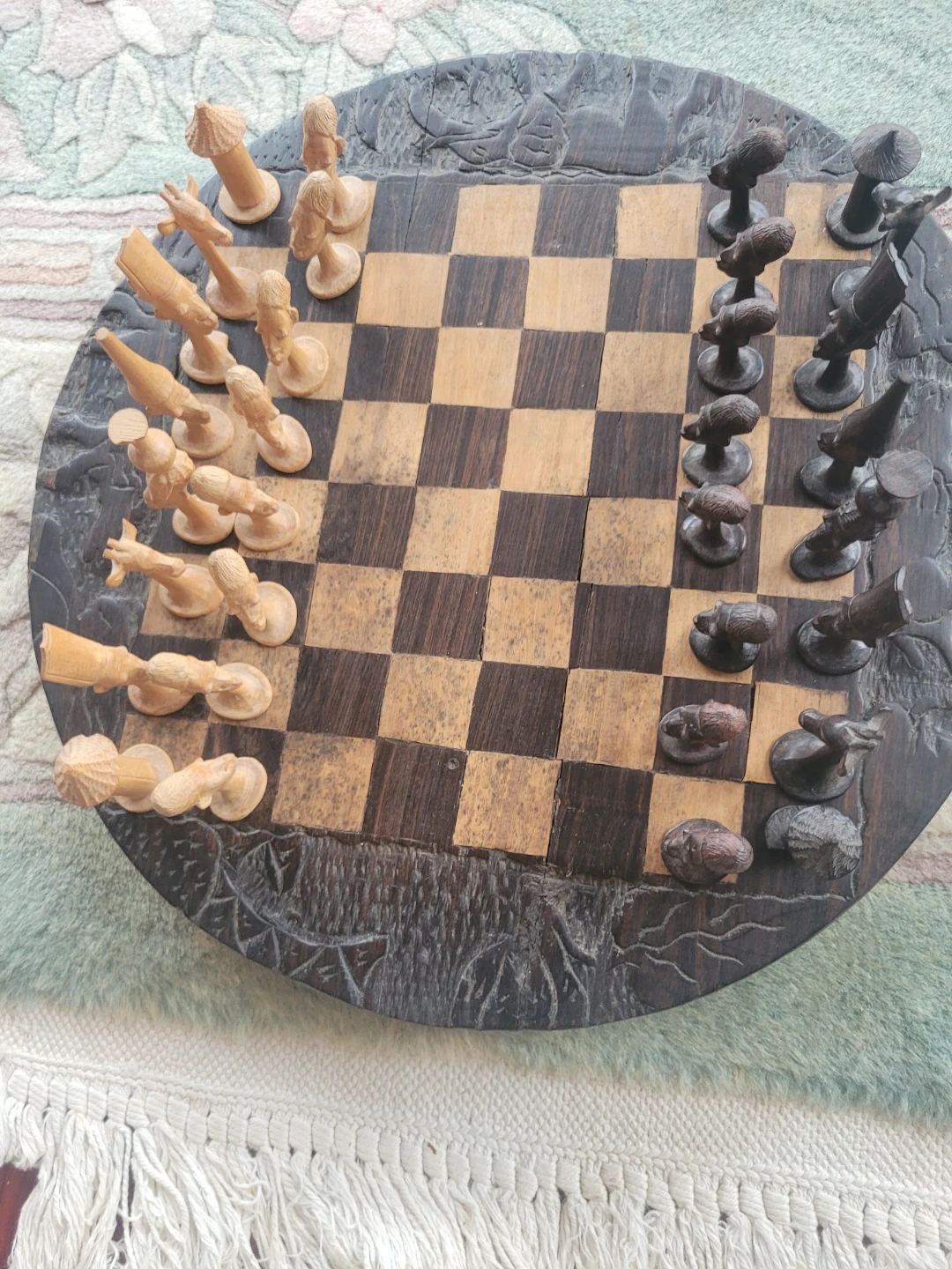 This is a beautifully carved wooden chess set with a round board. It includes a full set of light and dark pieces, each uniquely shaped. The board features intricate carved details around its edge.The white pieces are Nade of Ivory