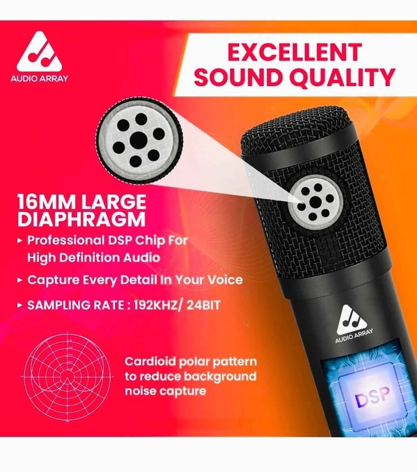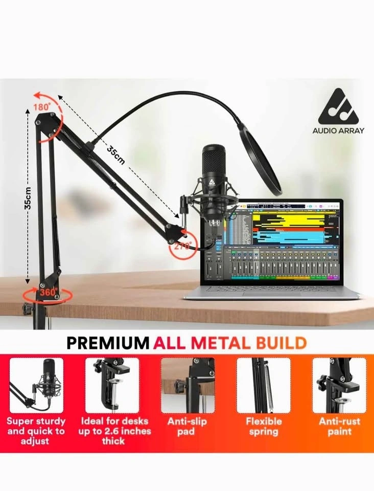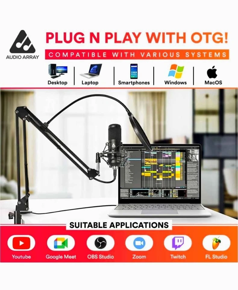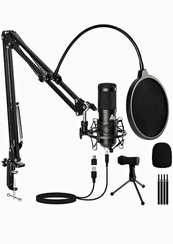 Includes: 1 condenser microphone, 1 metal shock mount, 1 adjustable suspension boom arm stand, 1 pop filter, 1 foam mic cover, 4 zip ties, 2.5m USB A to B cable, 1 Tripod, and 1 USB Type A To Type C Connector.