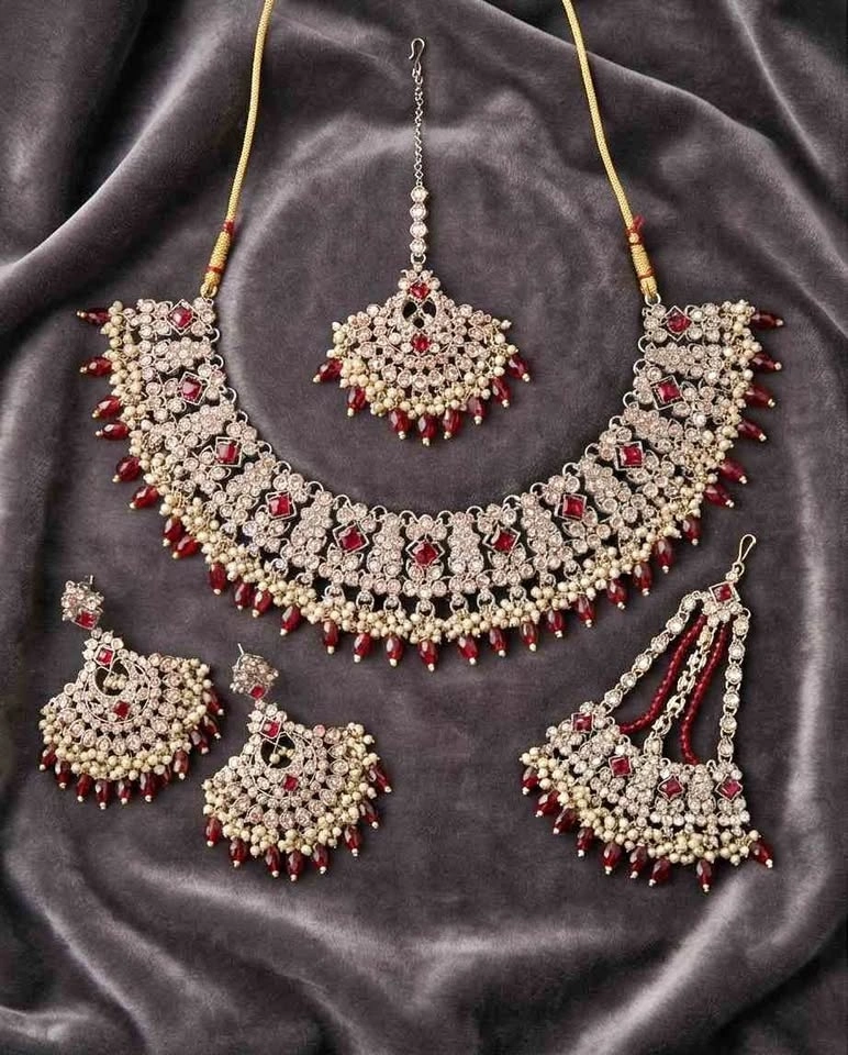 Elegant and eye-catching bridal jewelry set perfect for weddings, Eid, parties, and special occasions. Includes necklace, earrings, maang tikka, and passa. Beautiful red and pearl detailing for a royal look. Limited pieces available.