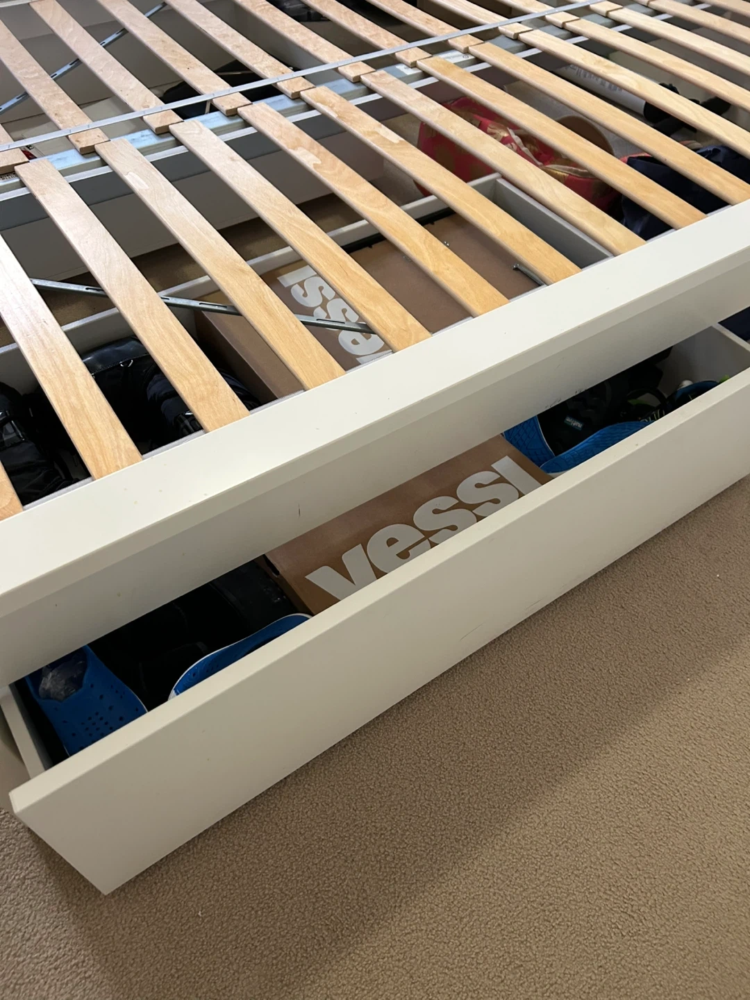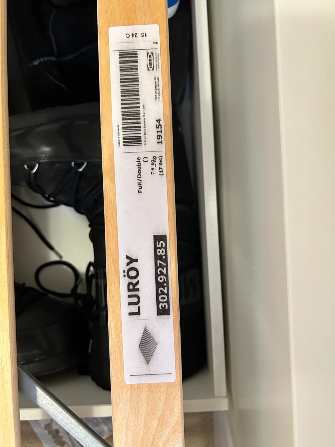 This is an IKEA LUROY bed frame in white. It's a full/double size and includes integrated storage drawers. The wooden slats are included for mattress support. With two drawers