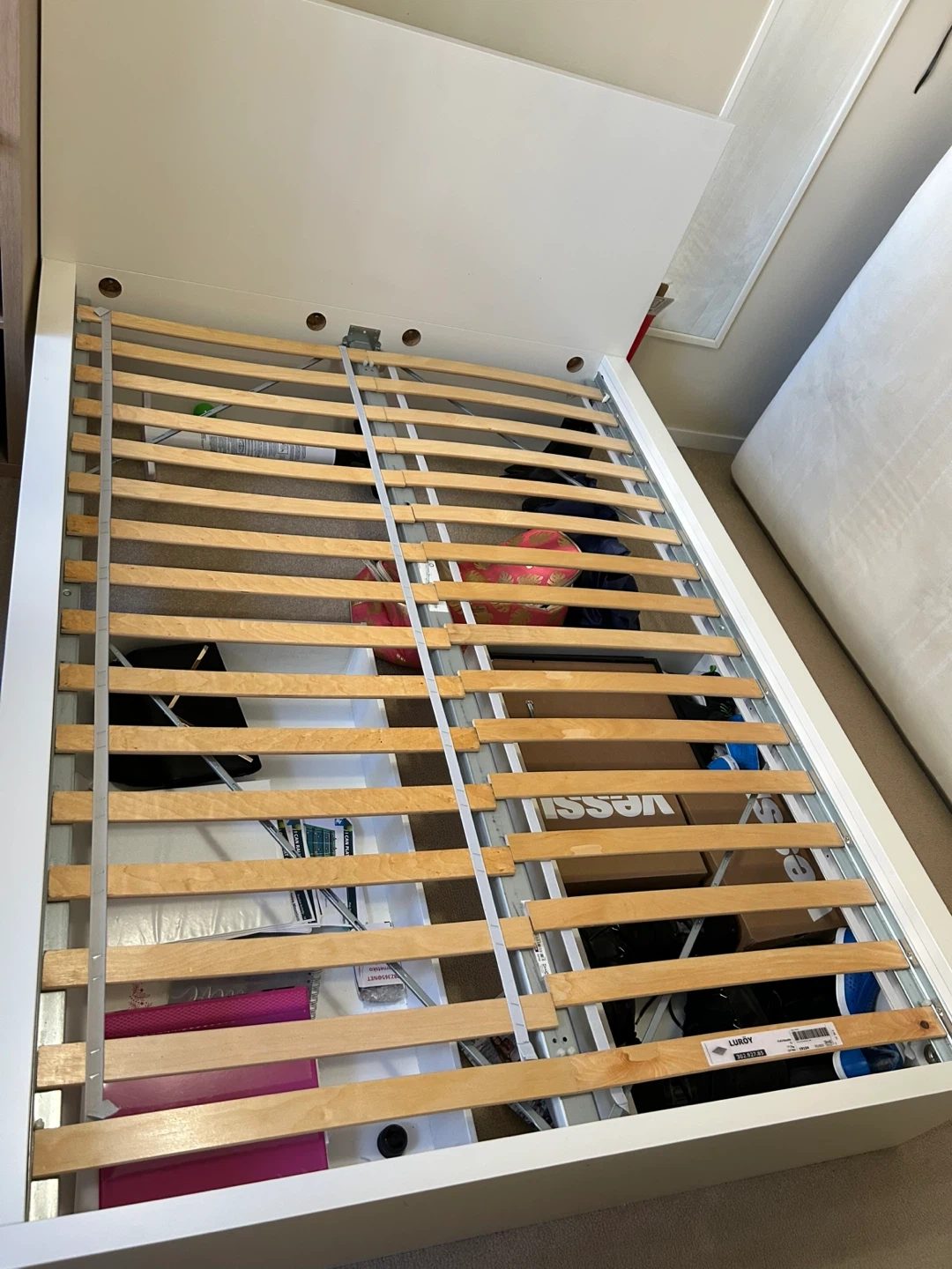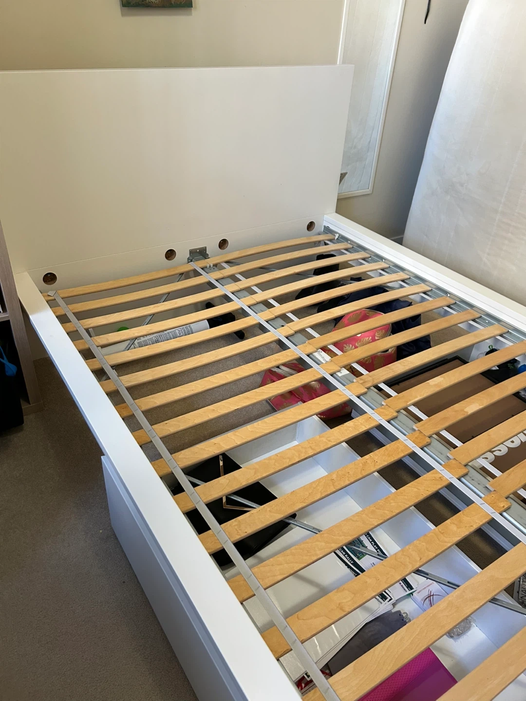 This is an IKEA LUROY bed frame in white. It's a full/double size and includes integrated storage drawers. The wooden slats are included for mattress support. With two drawers