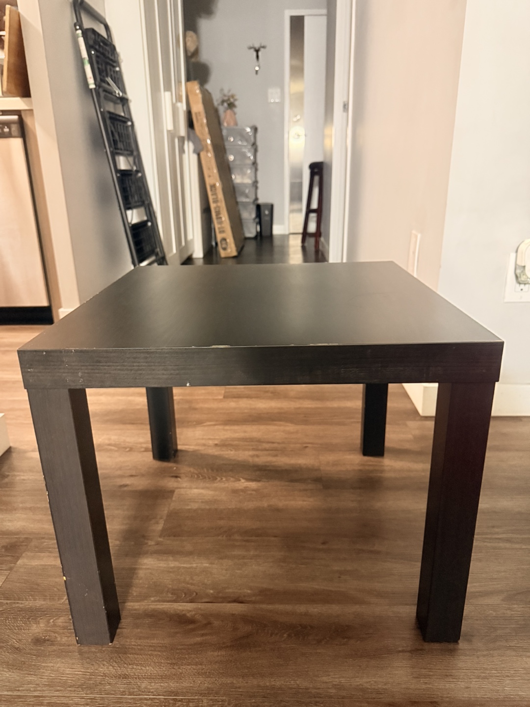 A simple, black square table. It has a dark finish. Perfect for placing next to a cozy couch, this table is a great way to hold your essentials within reach.