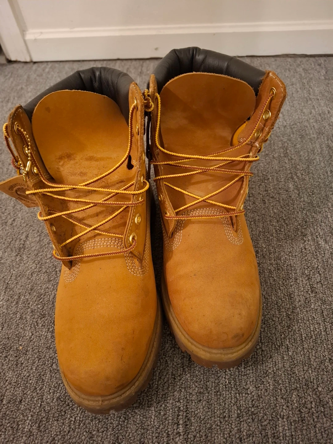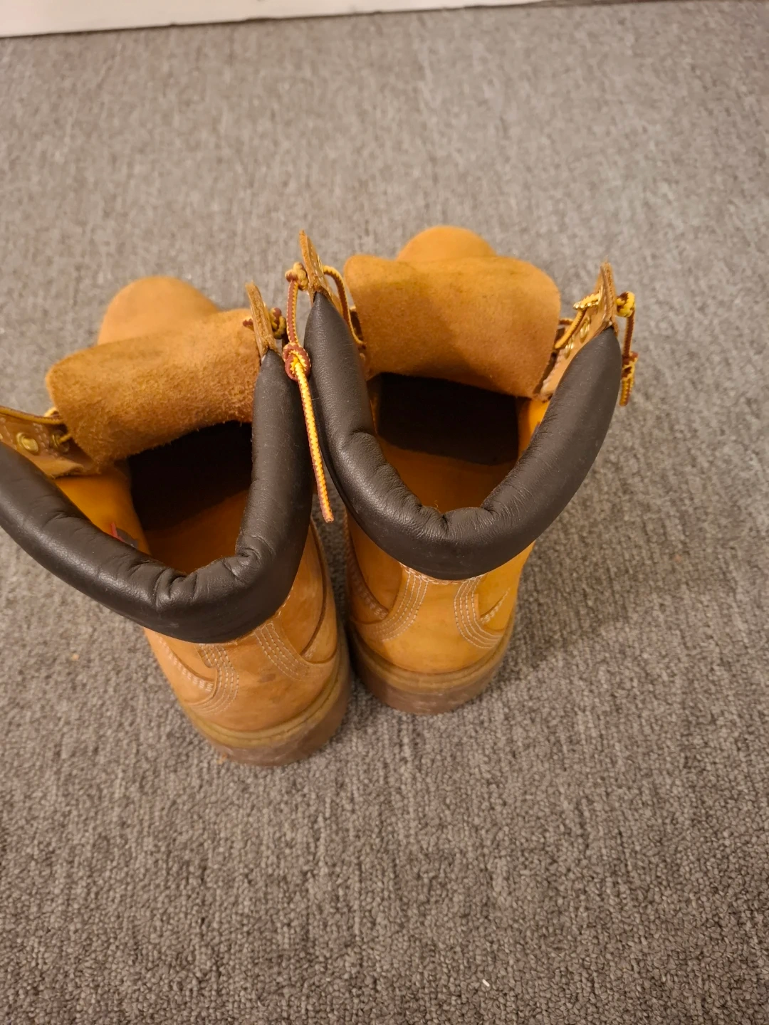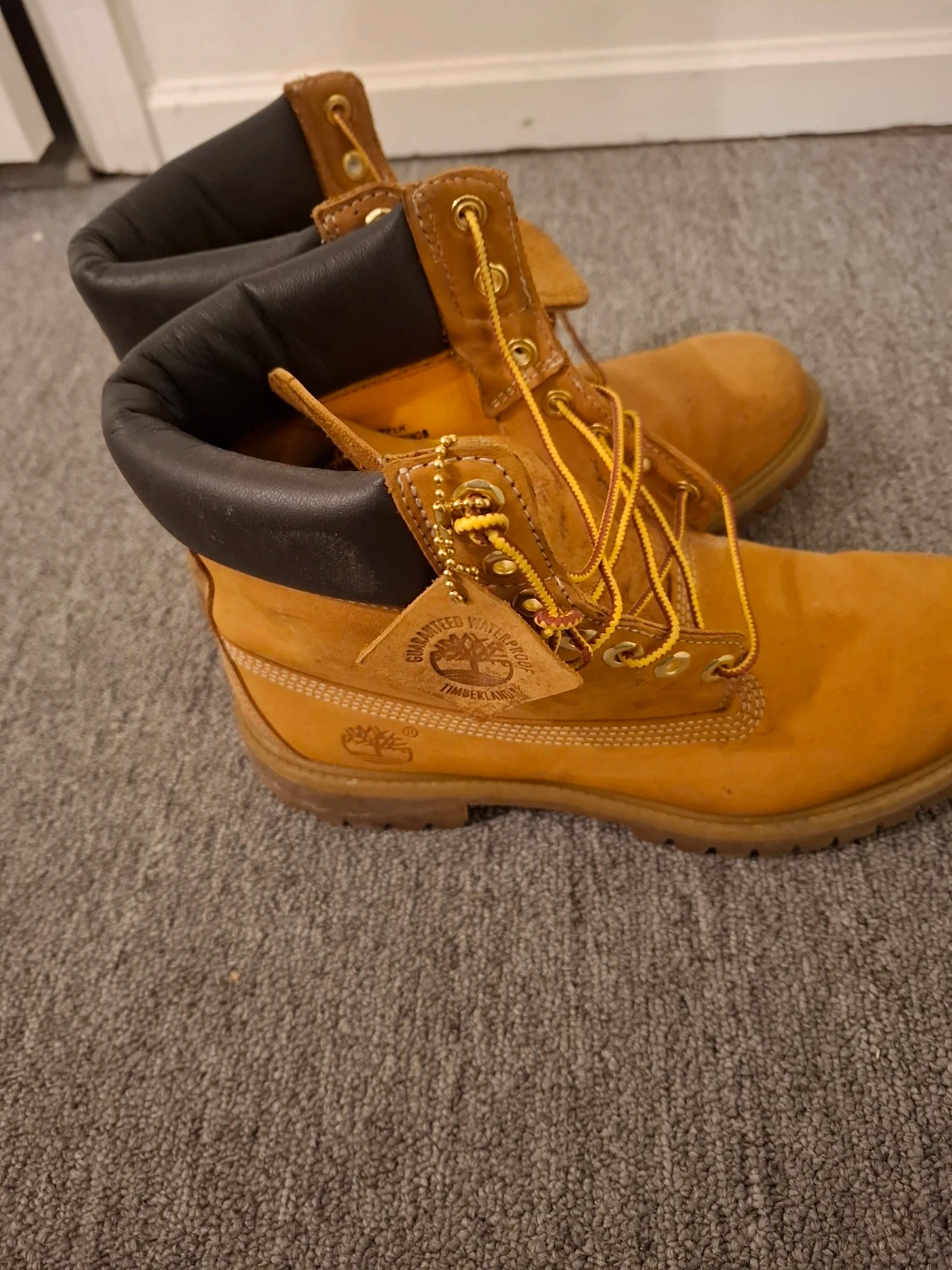 Selling a pair of classic Timberland 6-Inch Premium Waterproof Boots. They're in good condition with some signs of wear, as you can see in the photos. These are durable and iconic boots, perfect for any weather!