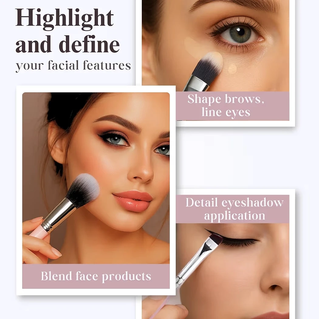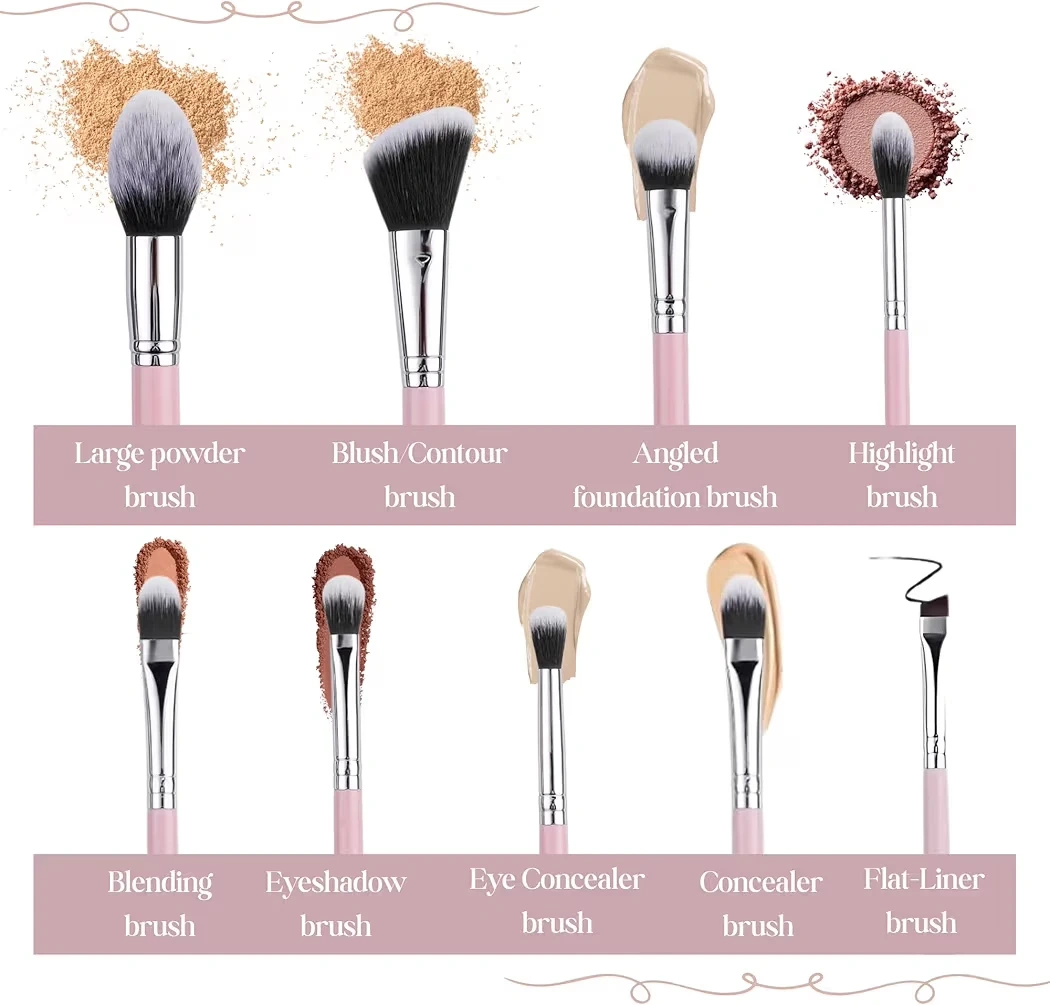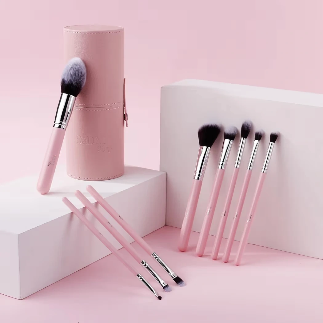 This 9-piece makeup brush set from SaDMI Shiny comes in a handy pink cylindrical case. It includes brushes for powder, blush, foundation, highlighting, blending, eyeshadow, concealer, and flat-lining. The brushes feature soft, dense bristles and ergonomic handles for comfortable use.