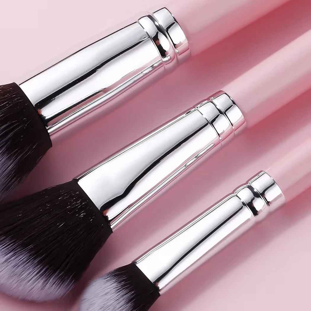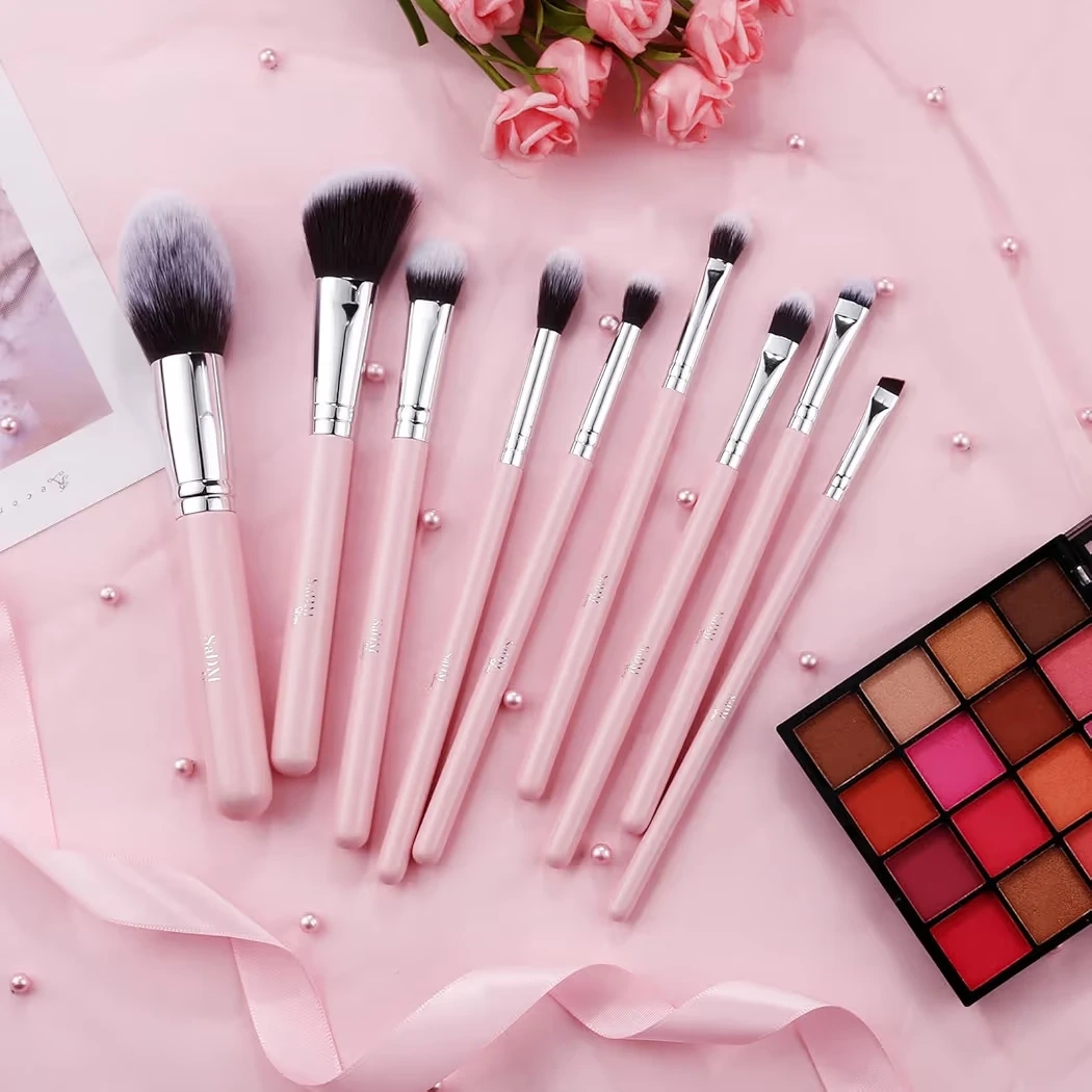 This 9-piece makeup brush set from SaDMI Shiny comes in a handy pink cylindrical case. It includes brushes for powder, blush, foundation, highlighting, blending, eyeshadow, concealer, and flat-lining. The brushes feature soft, dense bristles and ergonomic handles for comfortable use.