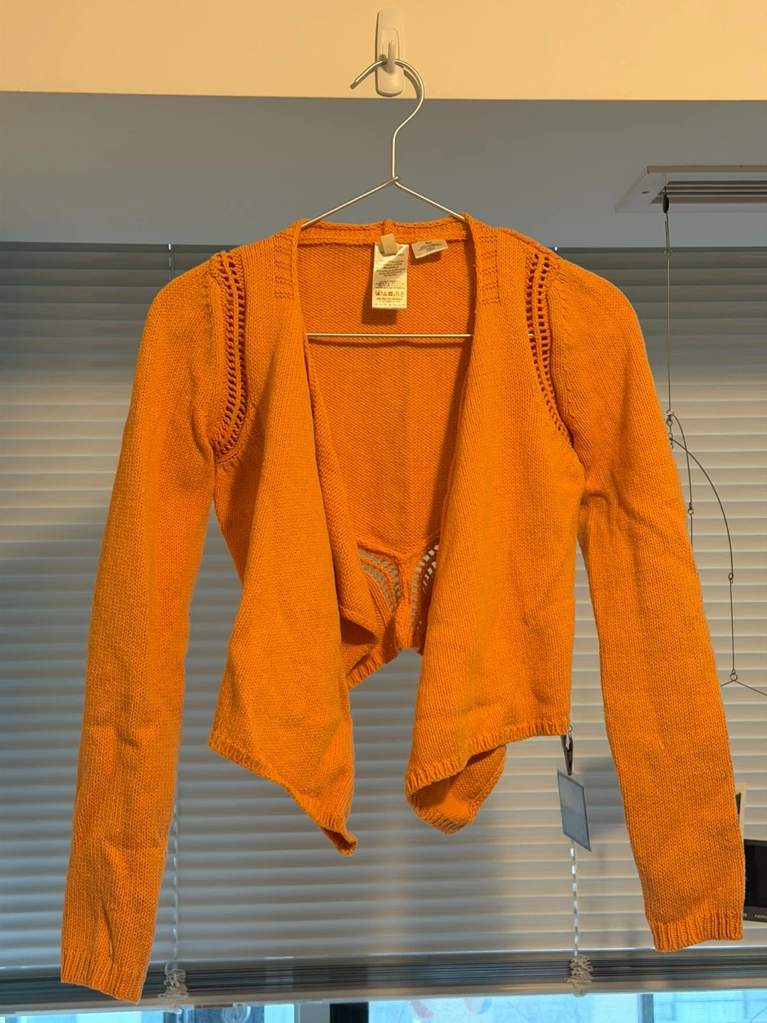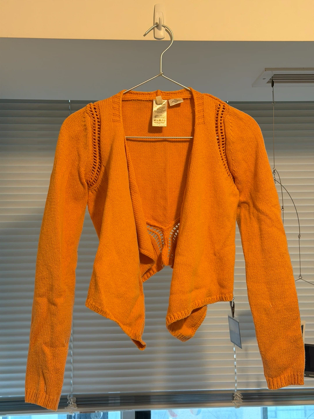This orange knit cardigan features a cropped fit with long sleeves. It has a unique open knit detail at the back and an asymmetrical hemline. Made from a soft knit material, it's perfect for layering over tops or dresses. Only wore once