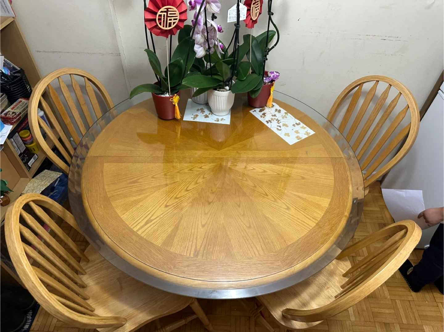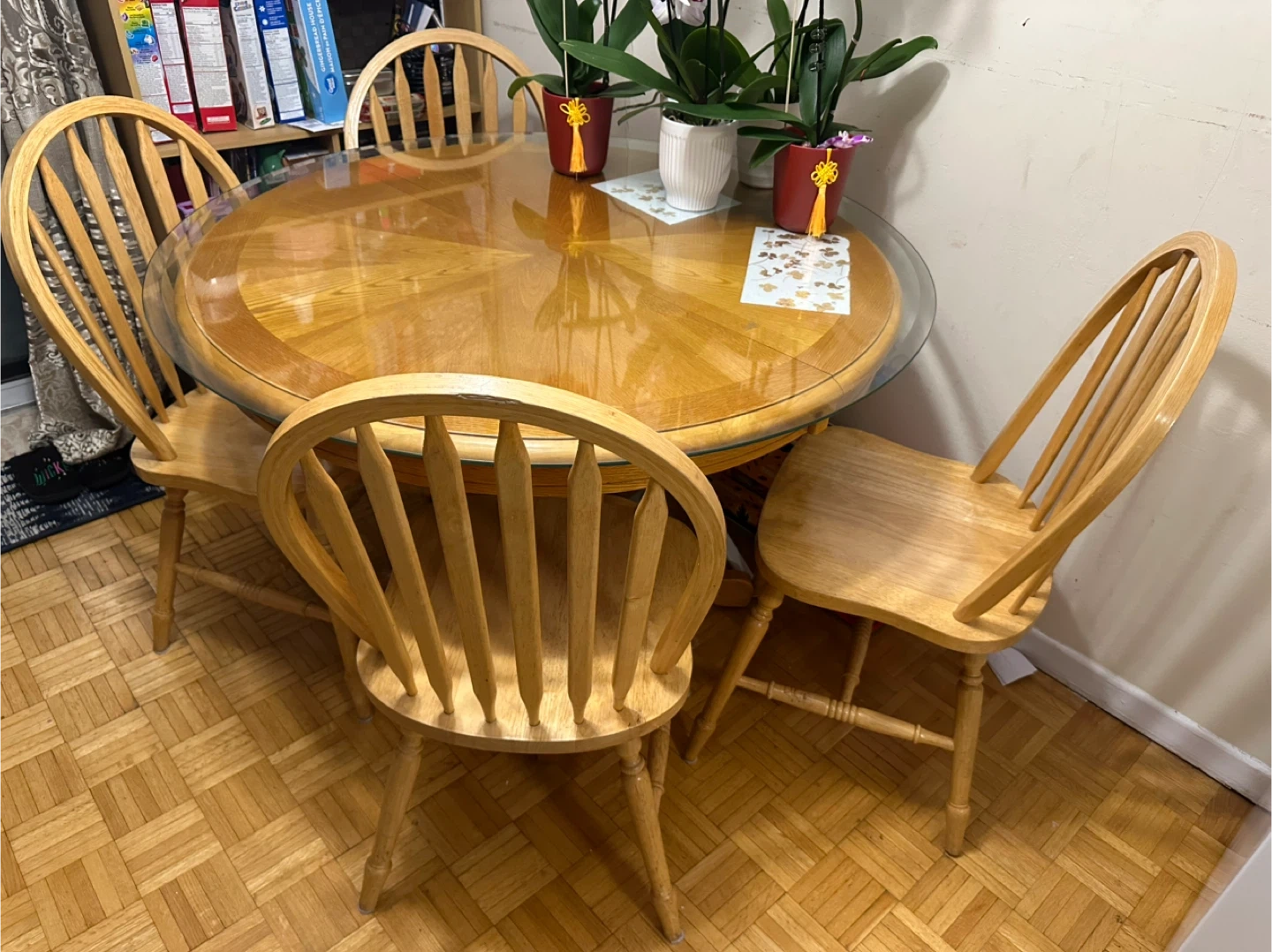 This is a round dining table with a glass top and four wooden chairs. The table has a light oak finish and a pedestal base. It's perfect for a smaller dining area. The chairs are made of wood with a slatted back design.