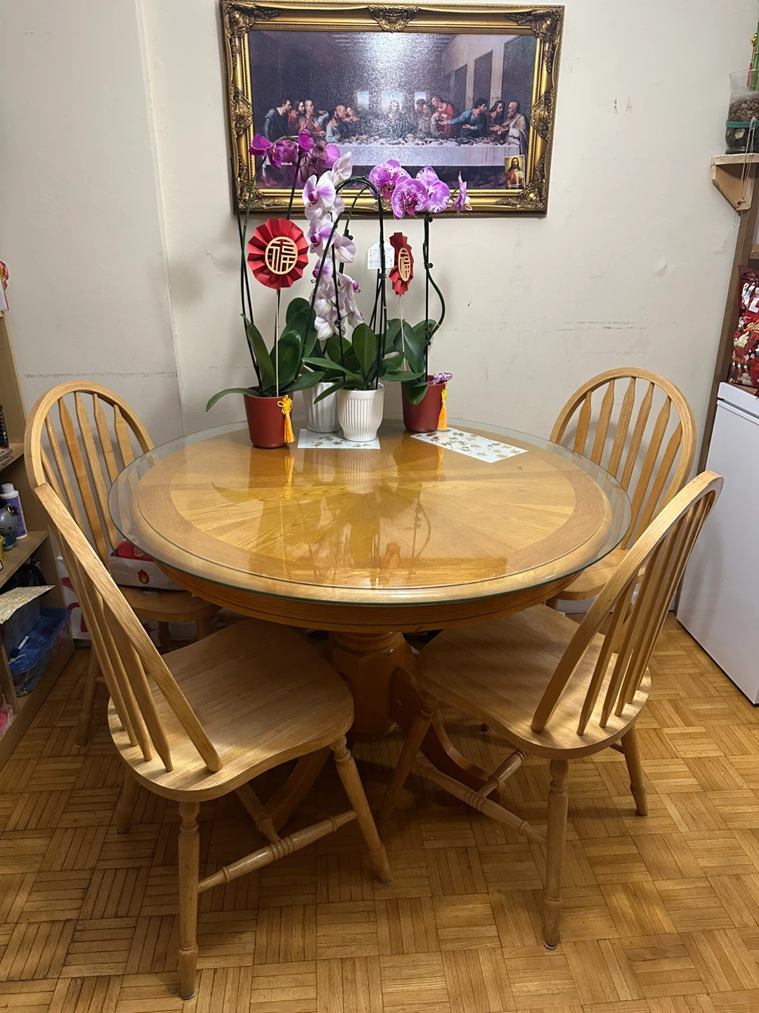 This is a round dining table with a glass top and four wooden chairs. The table has a light oak finish and a pedestal base. It's perfect for a smaller dining area. The chairs are made of wood with a slatted back design.