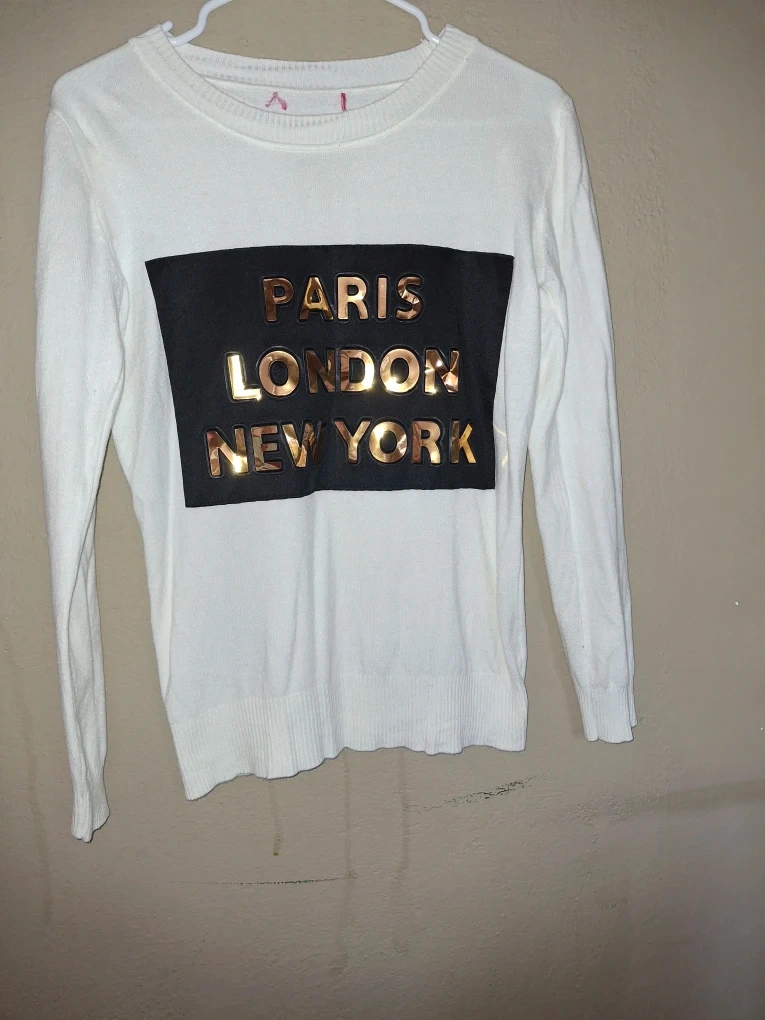 Here's a stylish white sweater featuring a unique design with 'Paris London New York' in gold lettering. It's perfect for adding a touch of international flair to your wardrobe. It's in great condition and ready for a new owner!