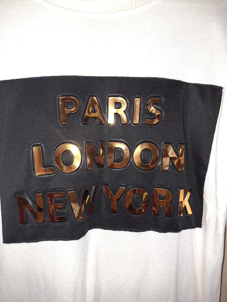 Here's a stylish white sweater featuring a unique design with 'Paris London New York' in gold lettering. It's perfect for adding a touch of international flair to your wardrobe. It's in great condition and ready for a new owner!