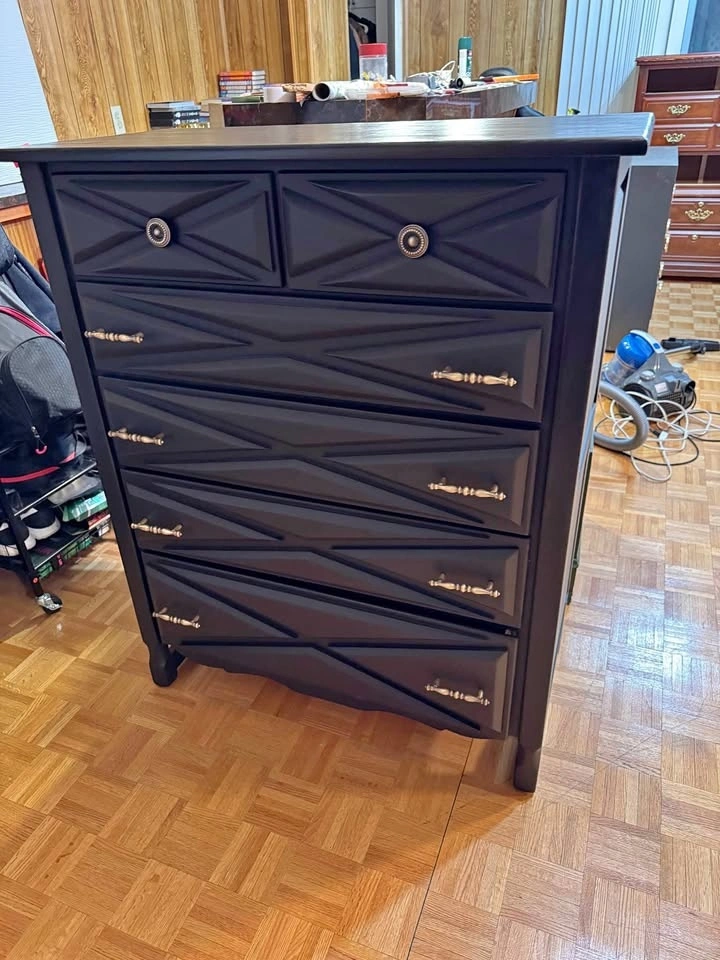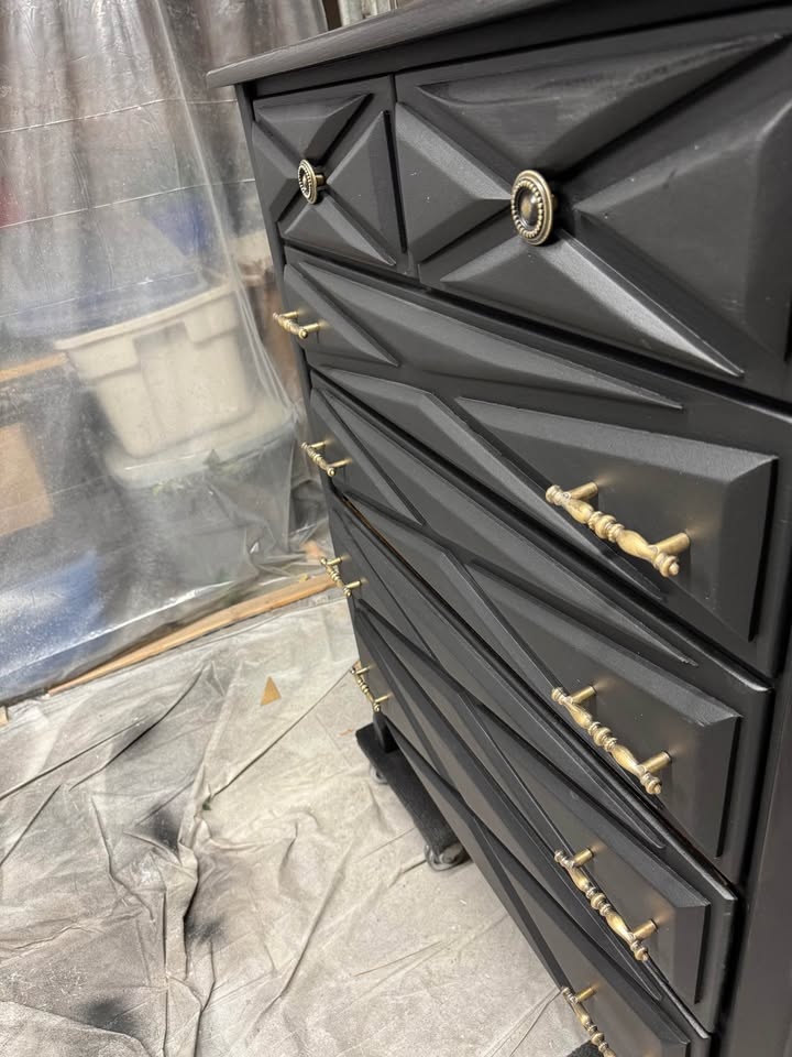 Add a bold, modern statement piece to your bedroom or living space! This solid wood 6-drawer dresser has been fully refinished in a matte black with striking geometric details. The drawers glide smoothly and offer tons of storage.