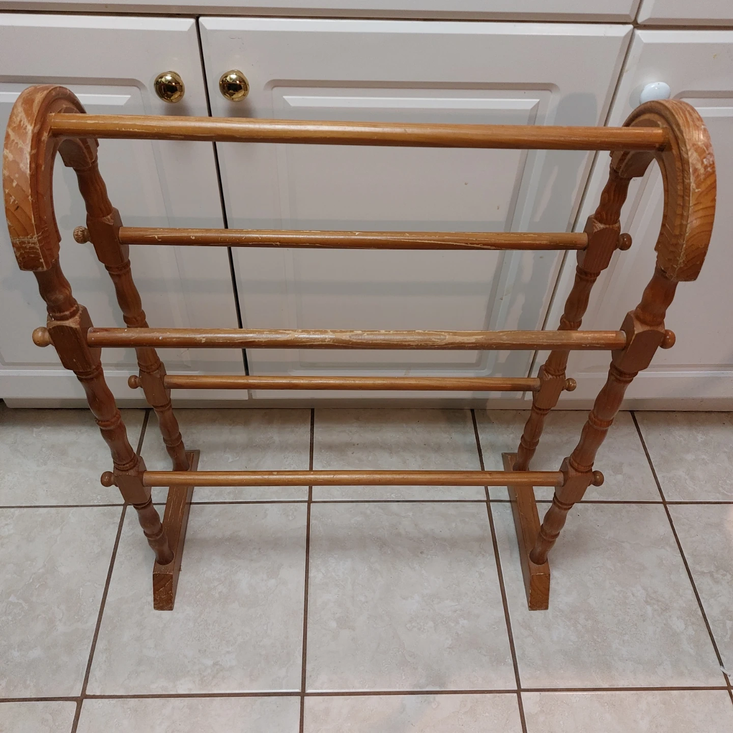 This wooden towel rack or blankets for storage . It's made of wood with a light brown stain. The rack's design is decorative and functional .The rack could use refinishing but is functional wirh character.
