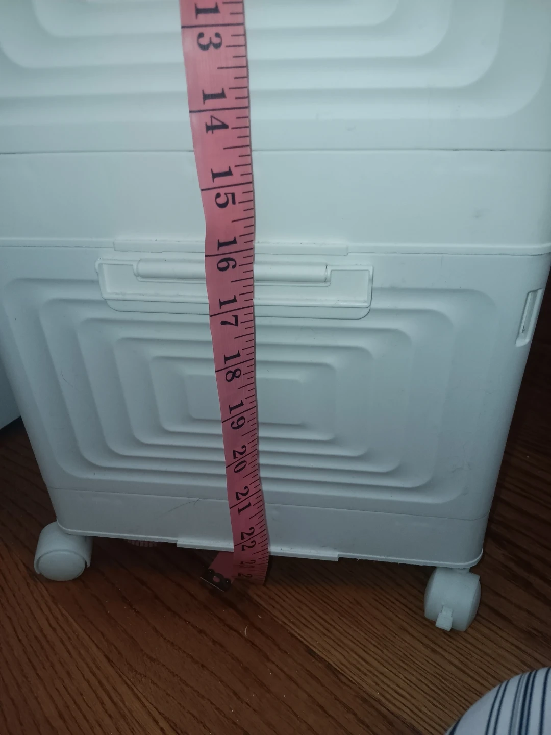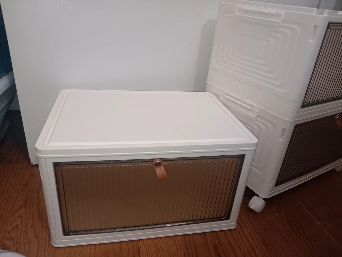 White plastic 3-drawer storage cabinet. Features brown translucent doors with faux leather pull tabs. Cabinet on wheels for easy mobility. Dimensions approximately 22" H x 14" W x 13" D. 100% collapsible.