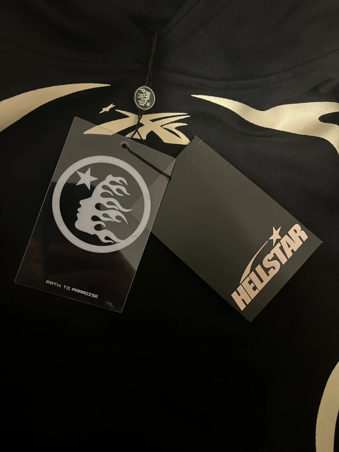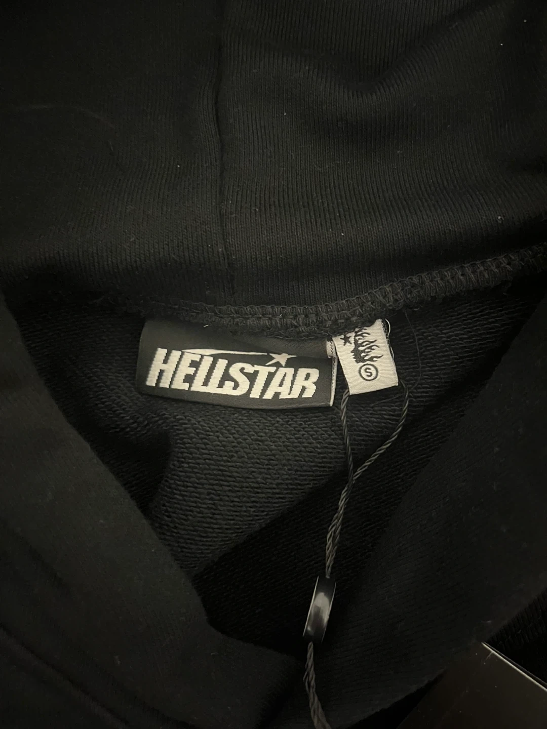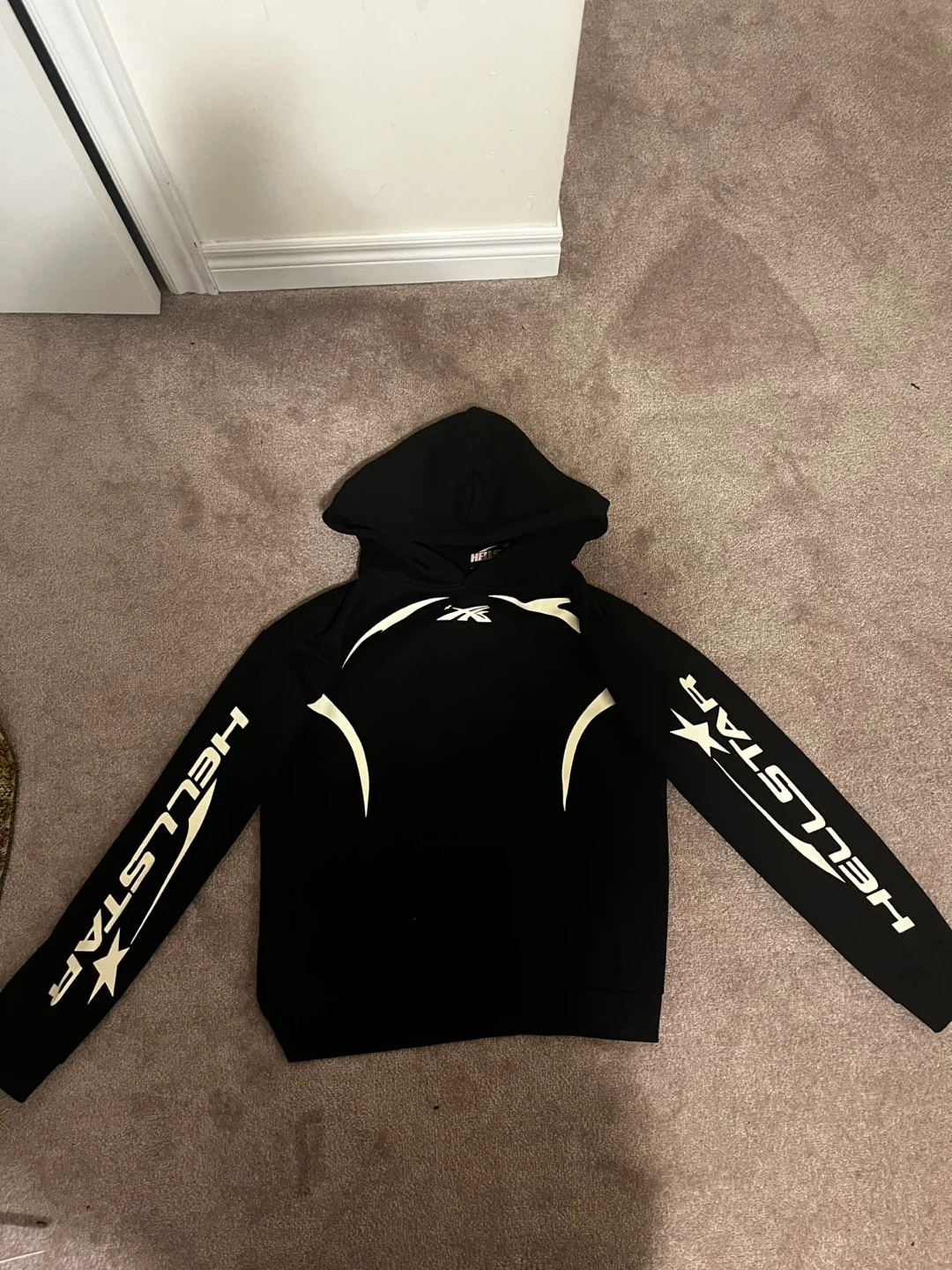 This is a black Hellstar hoodie with white graphic accents on the front and sleeves.