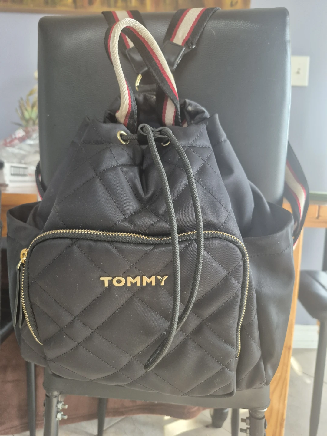 This is a black quilted Tommy Hilfiger backpack. It has adjustable shoulder straps and a drawstring closure. The exterior has a zippered pocket on the front.