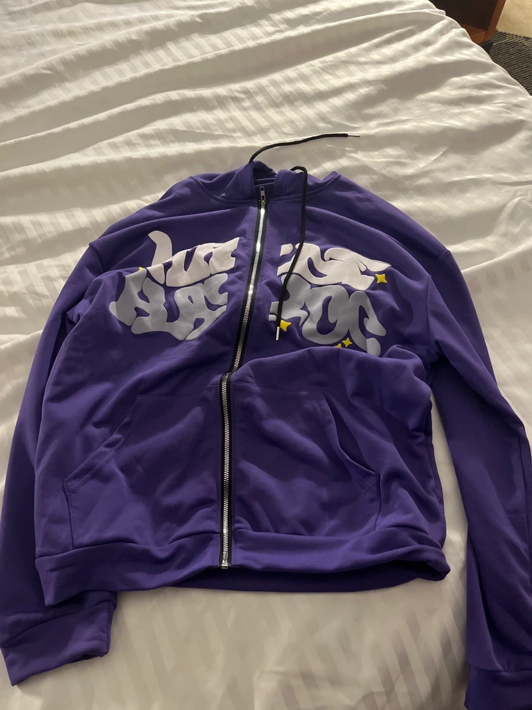 This purple zip-up hoodie features a cool graphic design on the front. It's a comfy and stylish piece for casual wear. Made from soft fabric, it's perfect for cooler days.