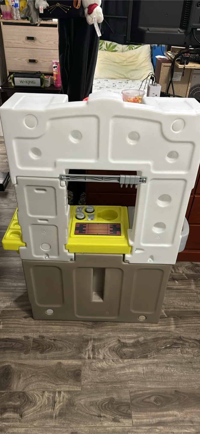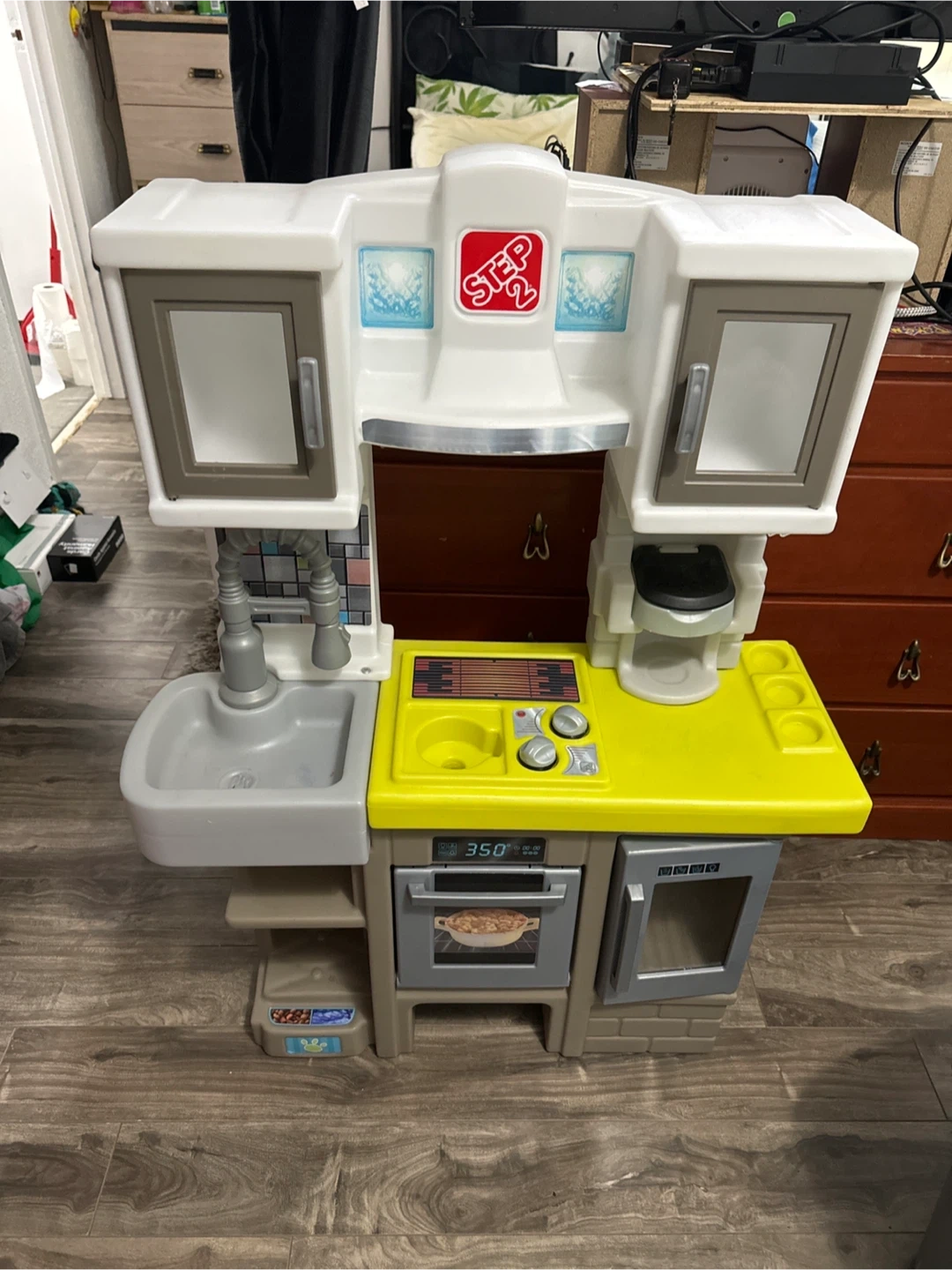 This Step2 play kitchen has a sink, oven, microwave, and coffee maker. It features knobs for the stove and oven. It's a great way for little ones to explore imaginative play!