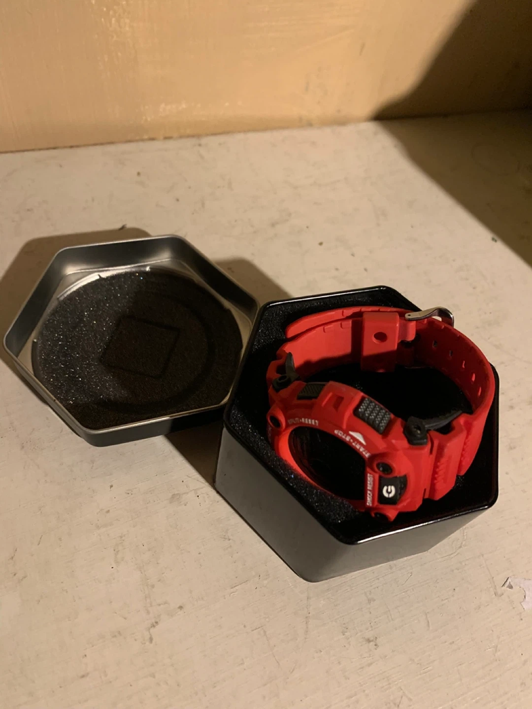 This is a red digital watch that comes with its original case. It has a durable design with multiple buttons for different functions. Great for everyday wear!