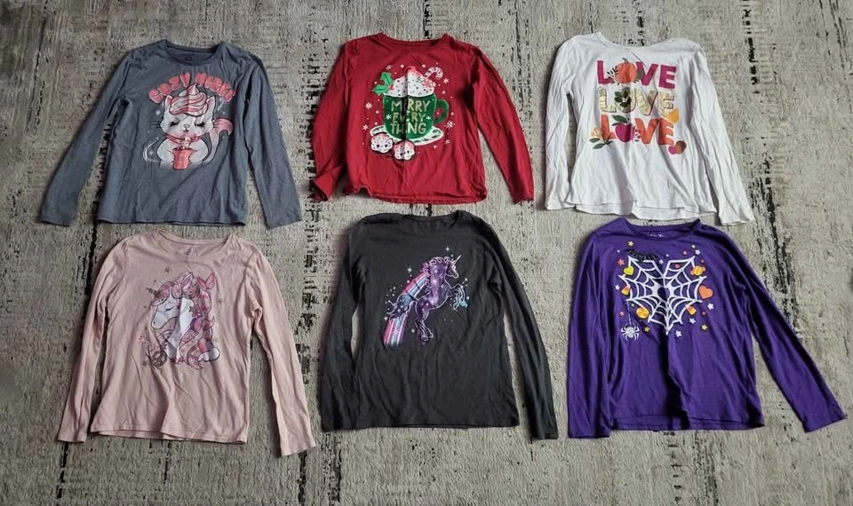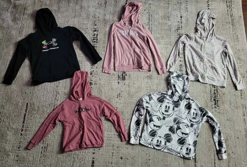 Girls size 14 fall/winter clothes. Lot #1. Mostly Carters and Children's Place brands. Includes: 2 zippered hoodies, 3 pullover hoodies (minor paint stains on Mickey Mouse pullover sleeves - pictured), 2 leggings, 1 pair of jeans, 6 long sleeve tops, 2 dresses, 1 pajama short, 1 pajama pant, and 1 pajama gown. Cash only.
