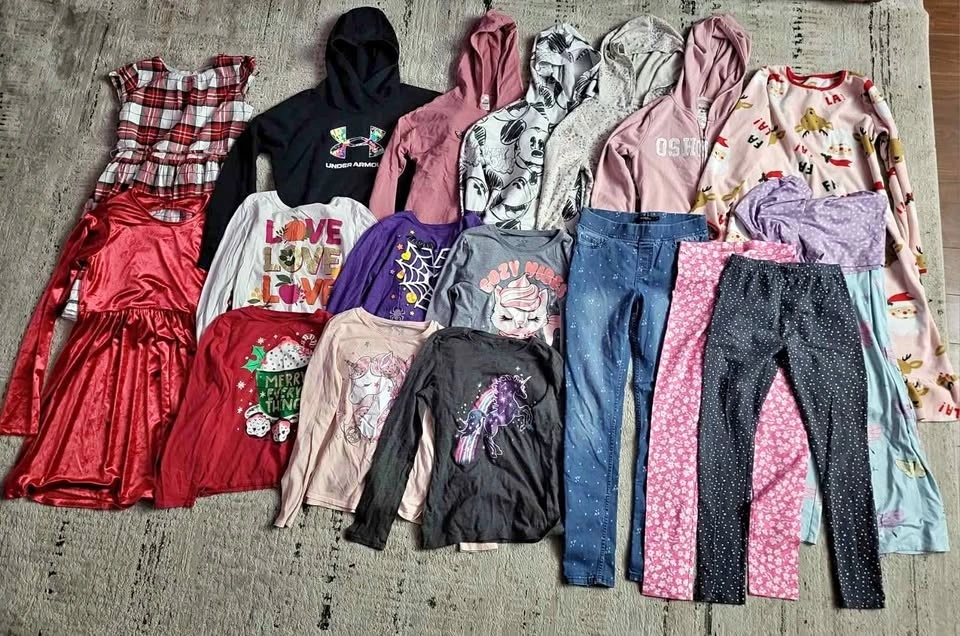 Girls size 14 fall/winter clothes. Lot #1. Mostly Carters and Children's Place brands. Includes: 2 zippered hoodies, 3 pullover hoodies (minor paint stains on Mickey Mouse pullover sleeves - pictured), 2 leggings, 1 pair of jeans, 6 long sleeve tops, 2 dresses, 1 pajama short, 1 pajama pant, and 1 pajama gown. Cash only.