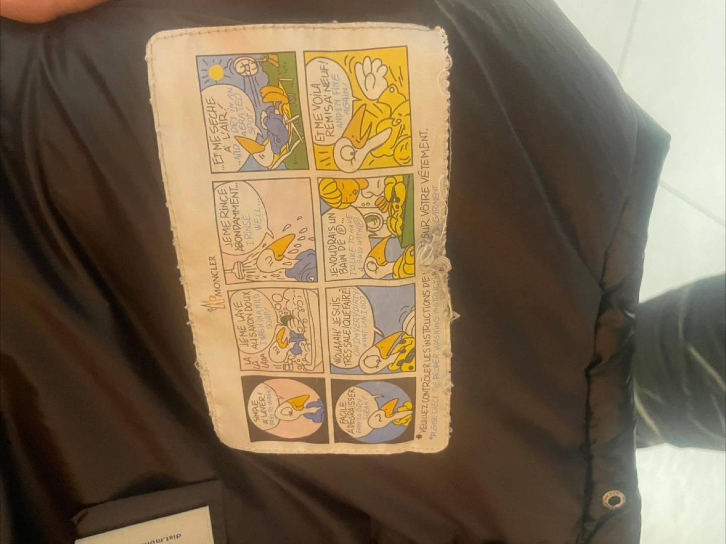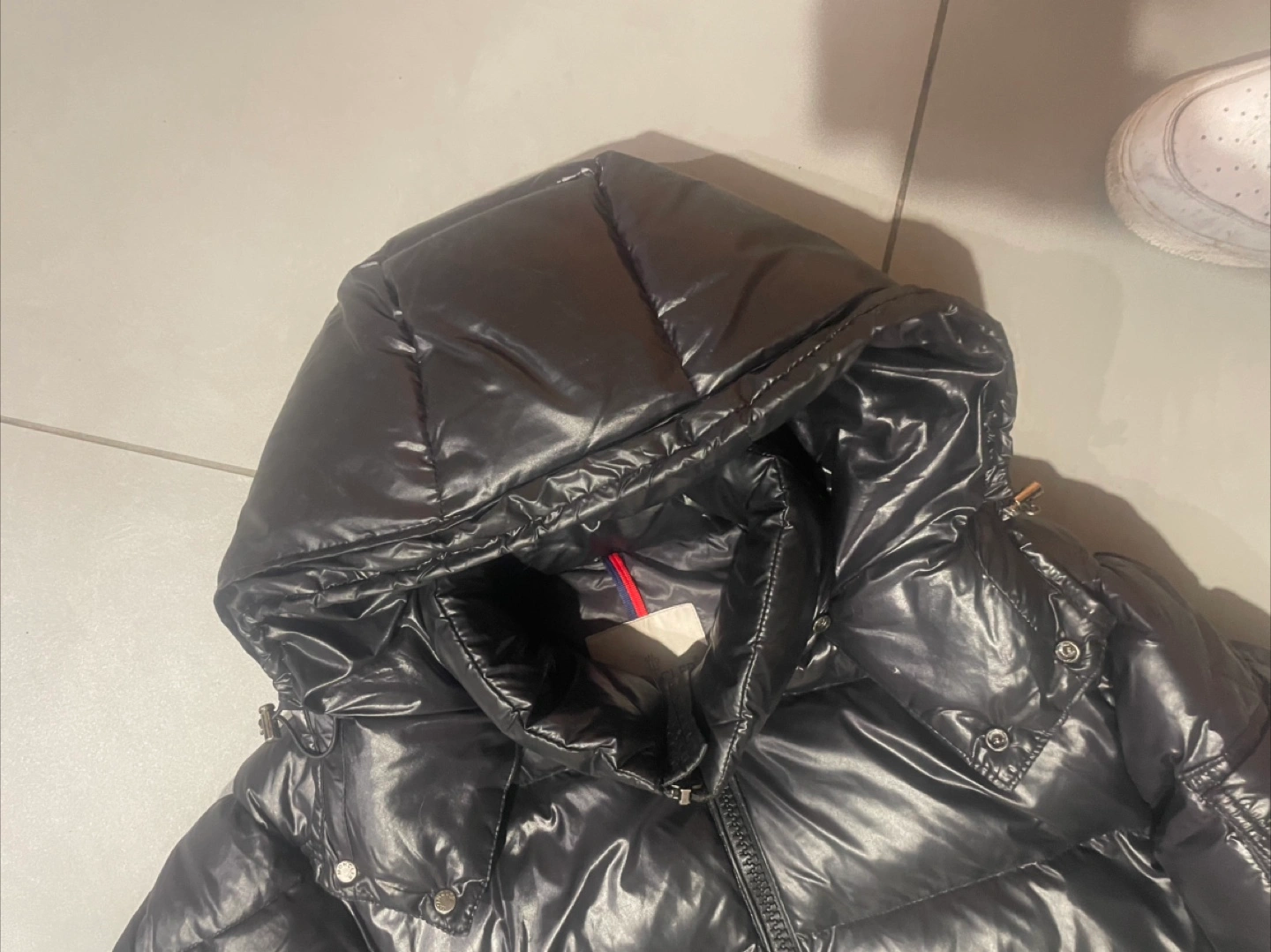 This is a Moncler black puffer jacket. It's a shiny, quilted down-filled coat with a hood. Includes original tags and down integrity system certification.