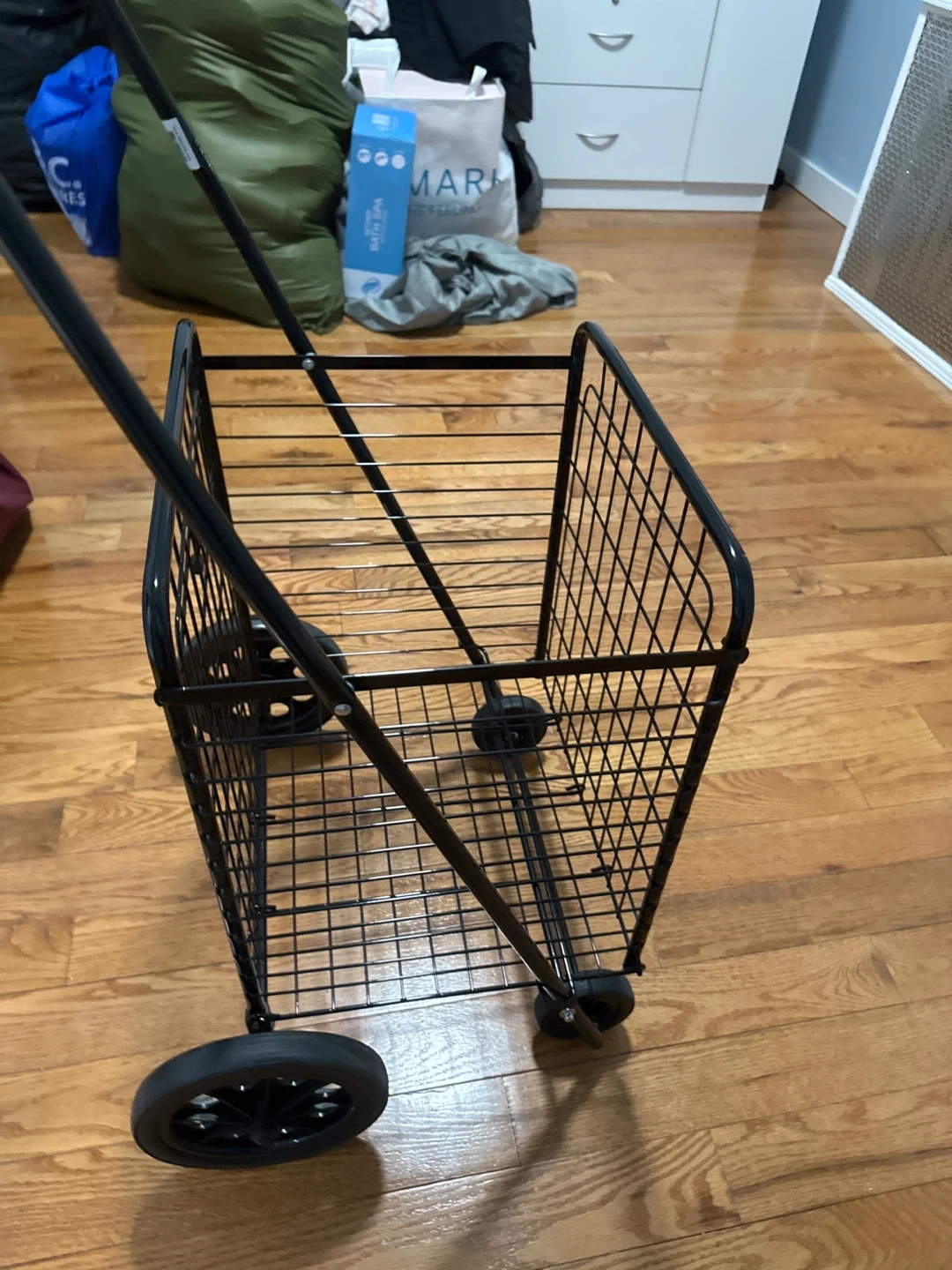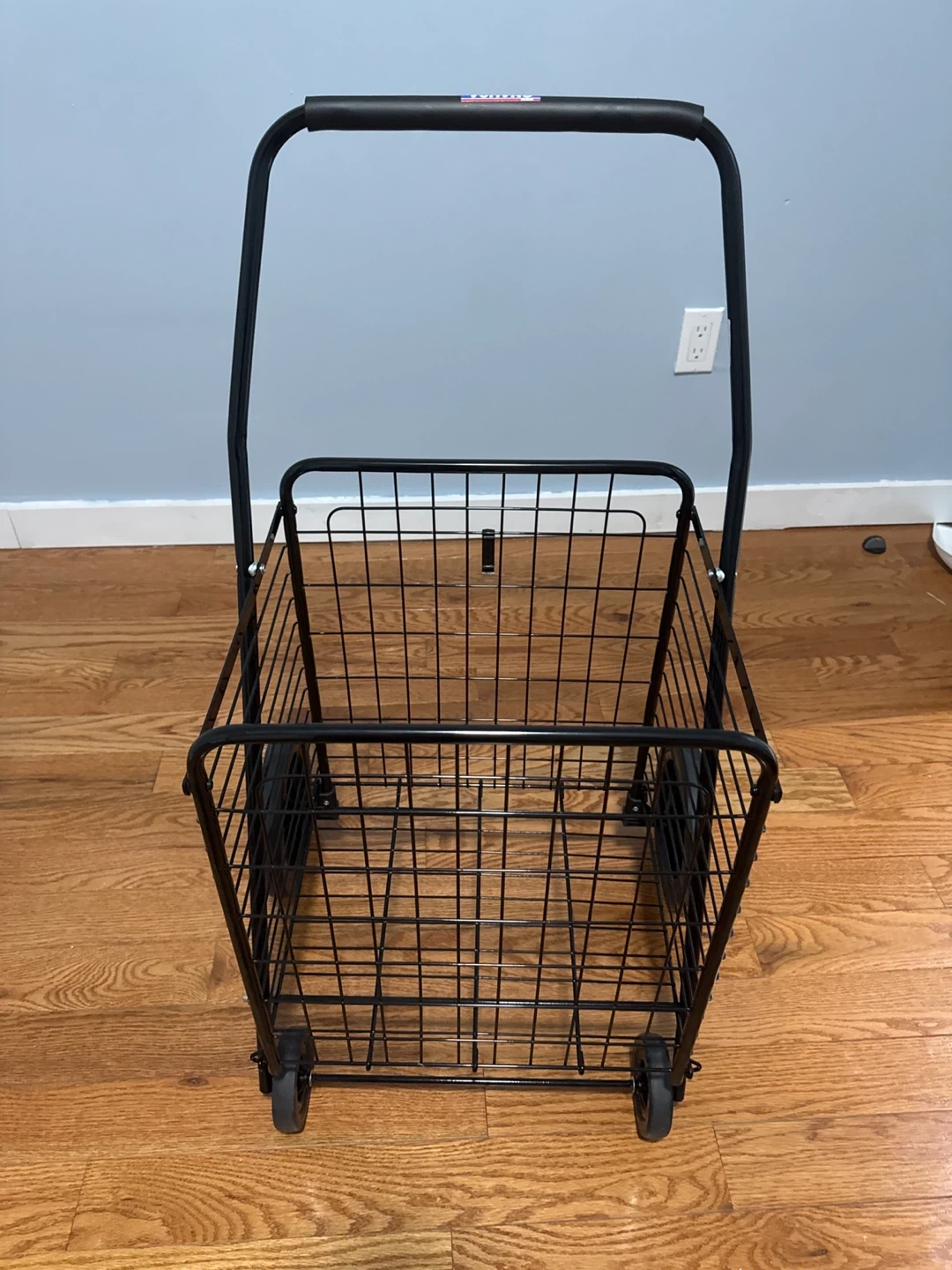 This black wire shopping cart makes hauling groceries and other items easy. It features a sturdy wire basket and a comfortable handle for transport. It's a great companion for trips to the store!