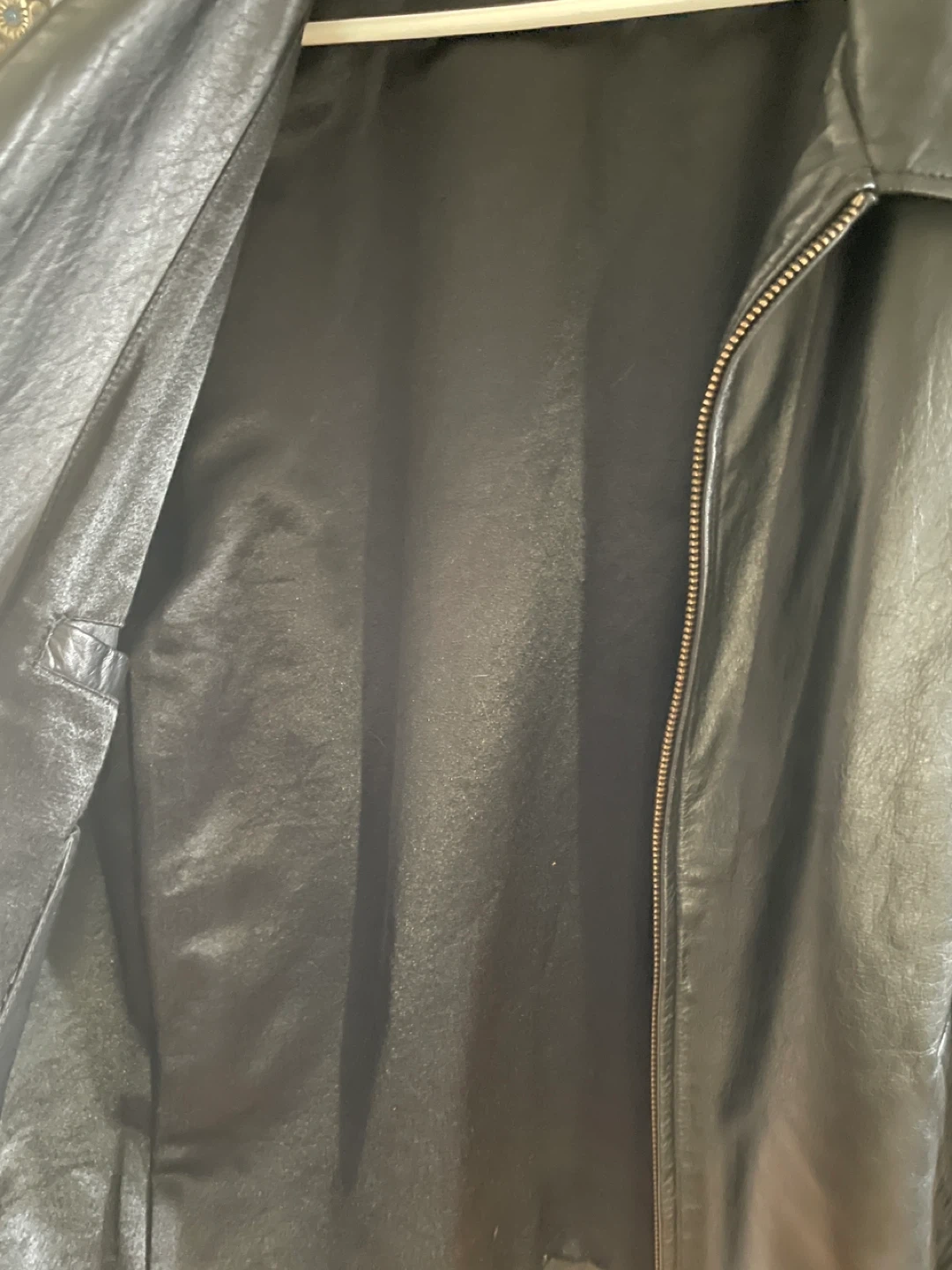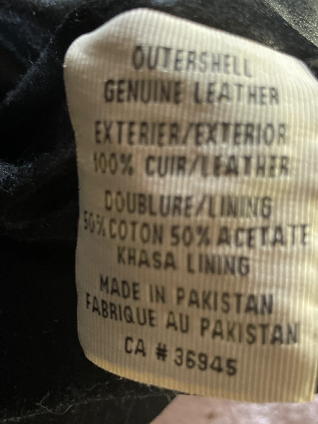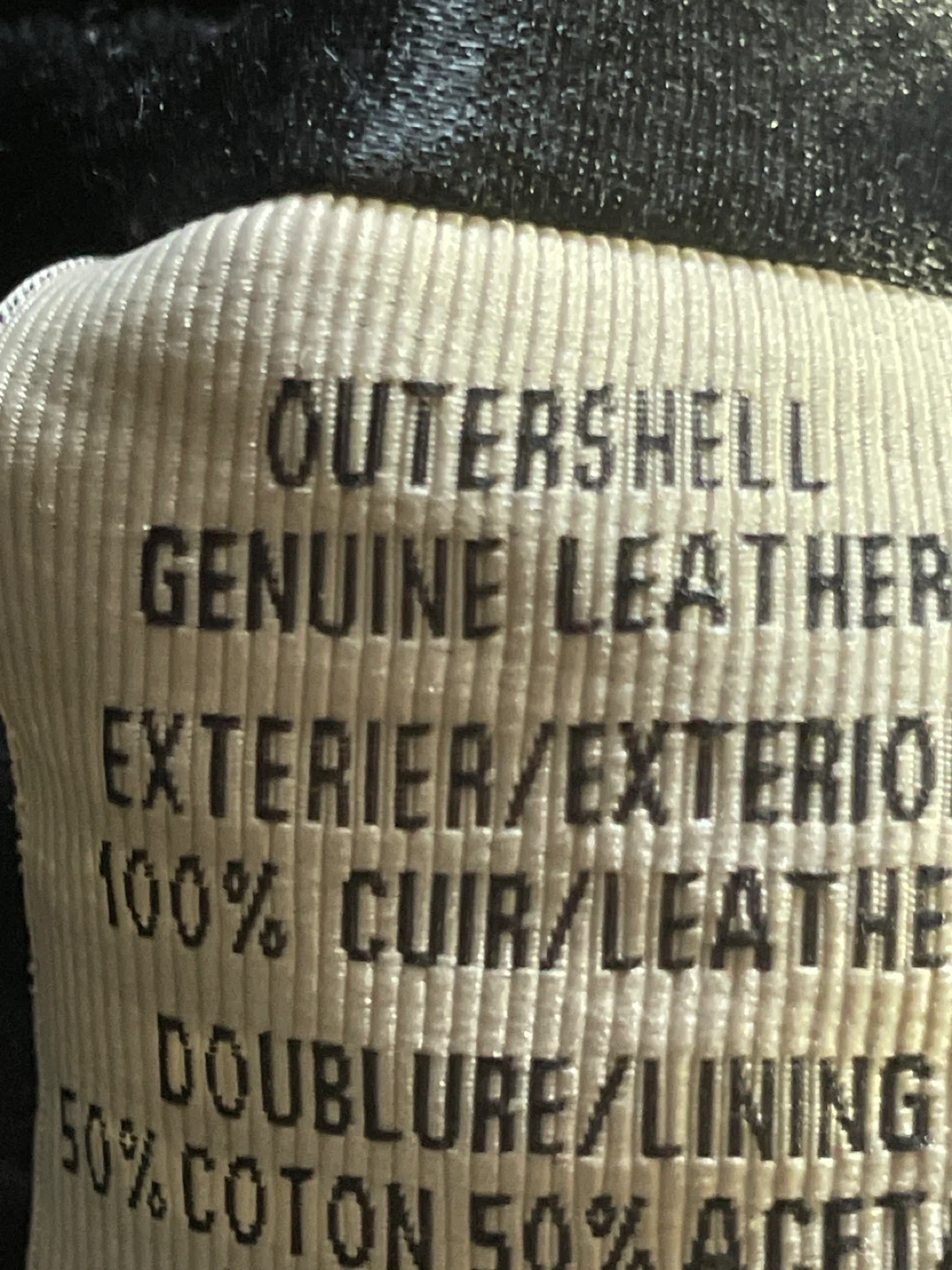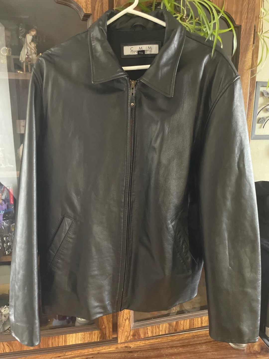 A black genuine leather jacket from CMM. The outer shell is 100% leather, with a lining of 50% cotton and 50% acetate. It's a stylish choice for cooler weather.