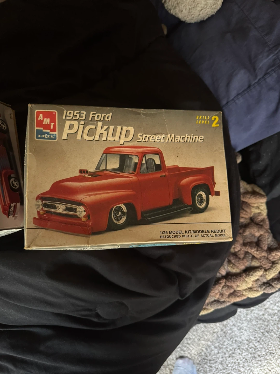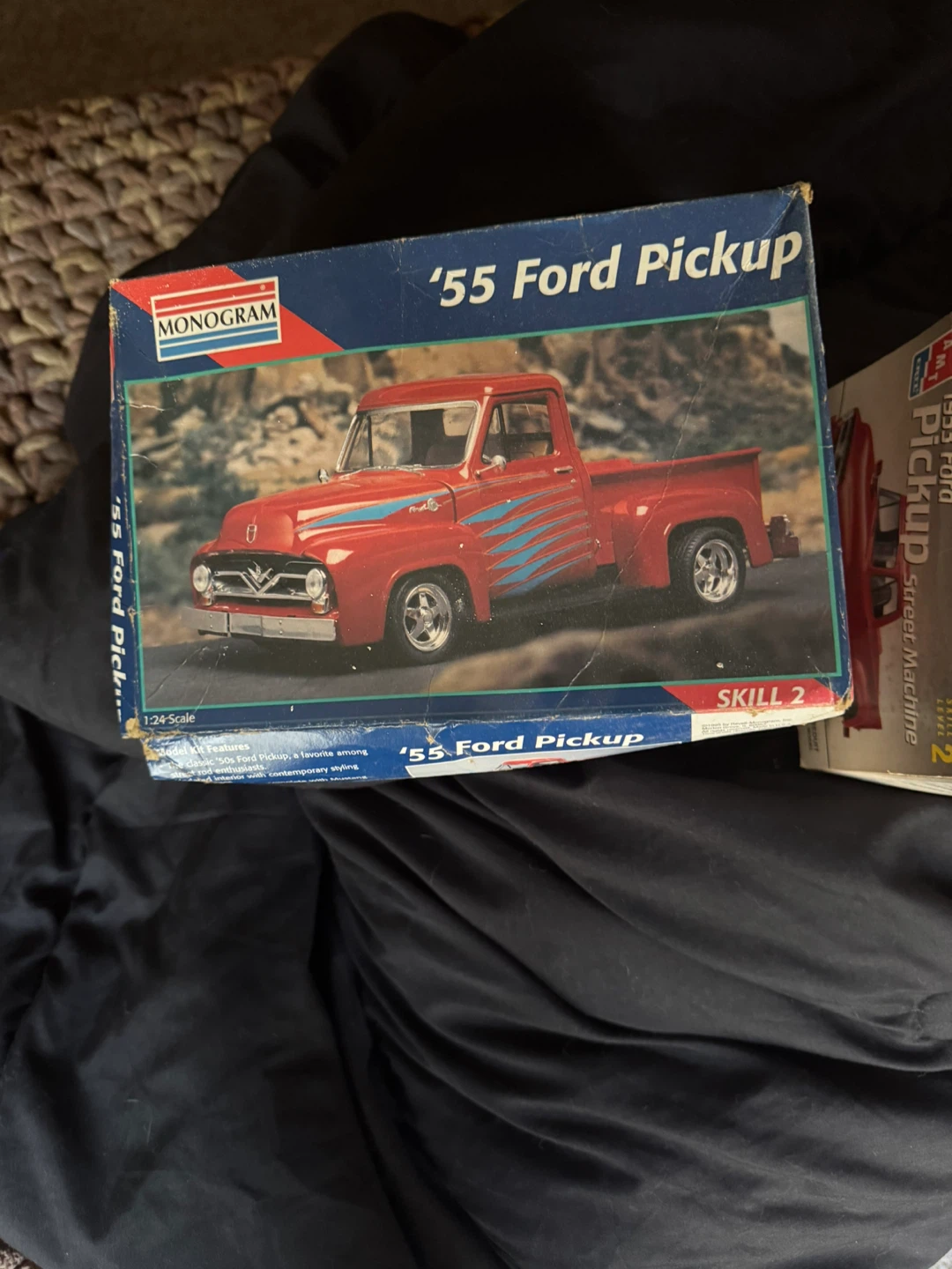 This is a Monogram skill level 2 model kit of a '55 Ford Pickup. It's 1:24 scale. Another similar kit, an AMT '53 Ford Pickup Street Machine, is also pictured.