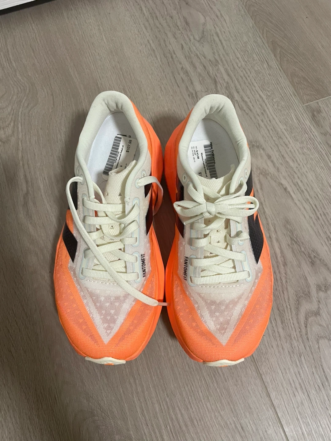 Selling a pair of New Balance FuelCell Rebel V3 running shoes in size US 10.5. They feature a bright orange colourway with a black logo. These shoes are designed with FantomFit technology for a secure and comfortable fit. Perfect for running or casual wear!