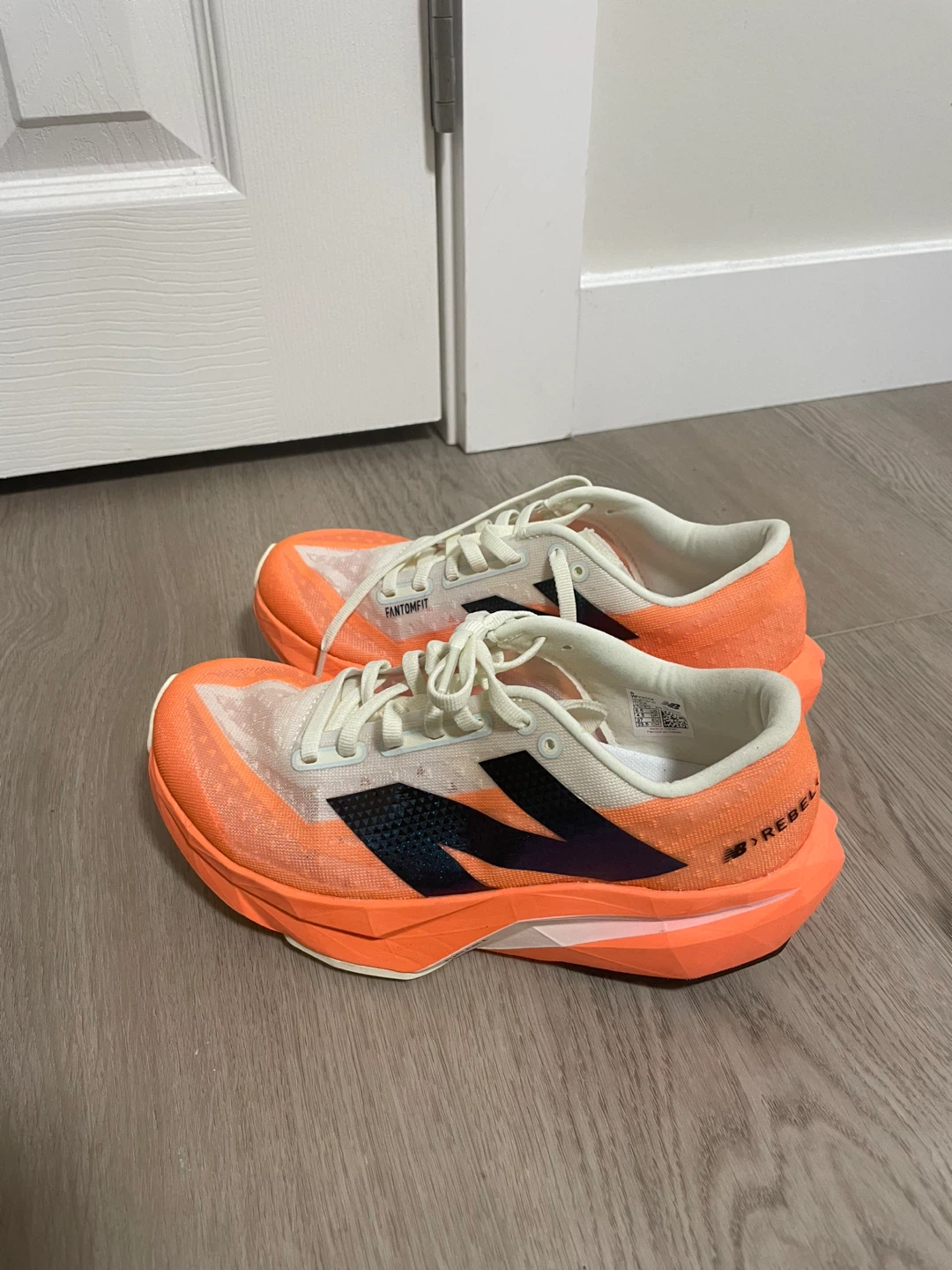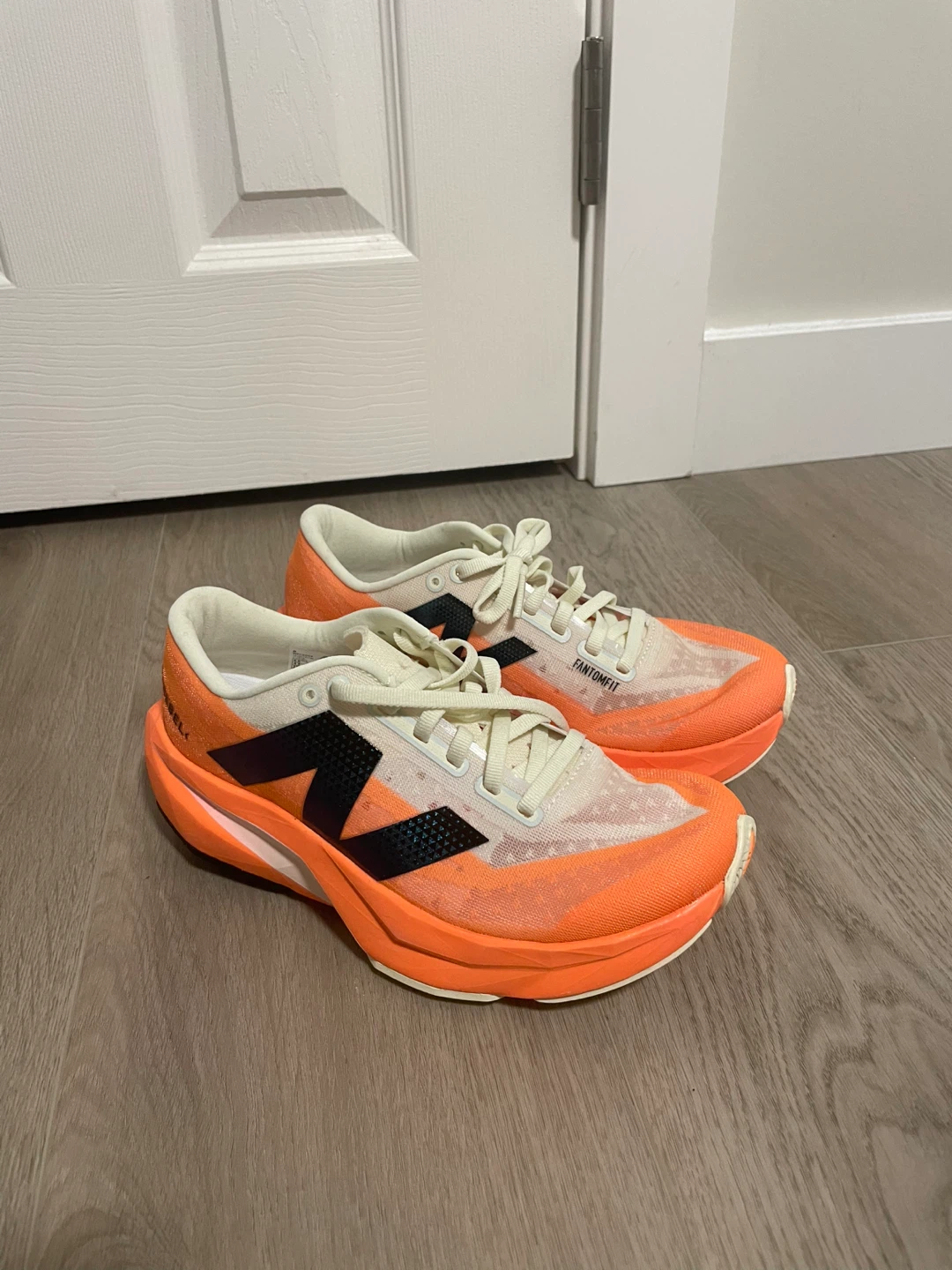 Selling a pair of New Balance FuelCell Rebel V3 running shoes in size US 10.5. They feature a bright orange colourway with a black logo. These shoes are designed with FantomFit technology for a secure and comfortable fit. Perfect for running or casual wear!