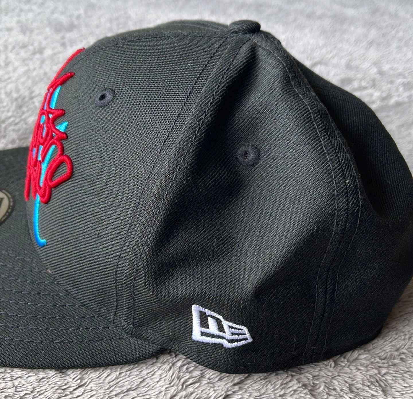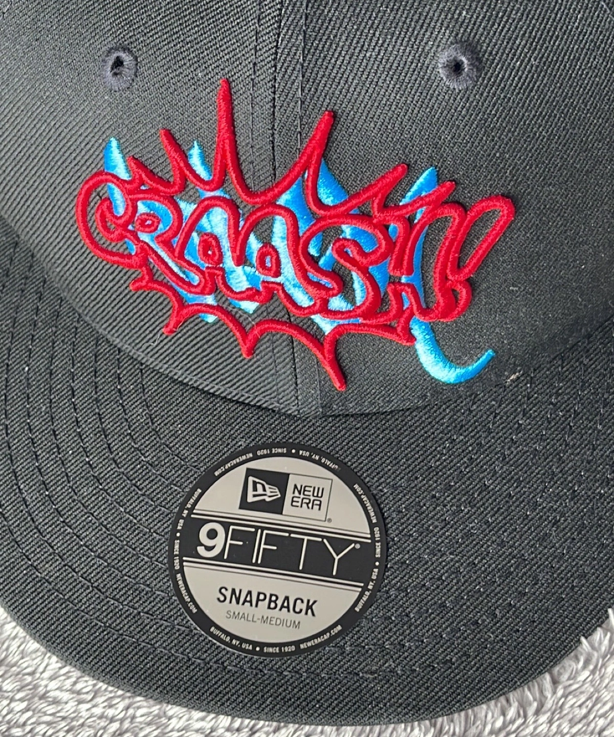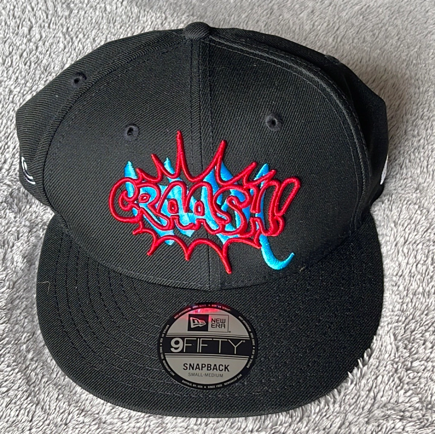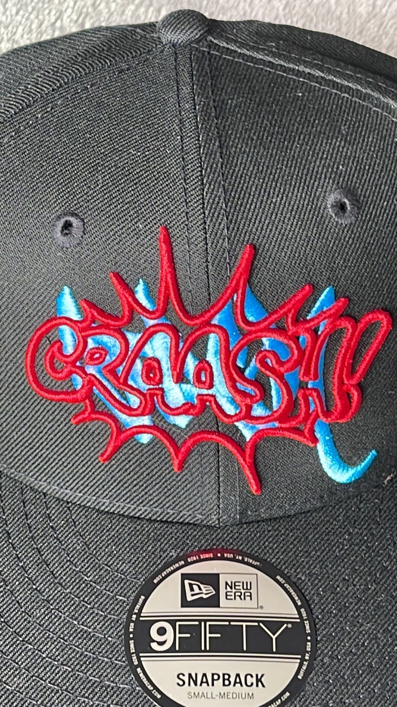 This is a New Era 9FIFTY snapback hat featuring a "Crash" & “Stash” design. It's black with red and blue embroidery. The size is small-medium.