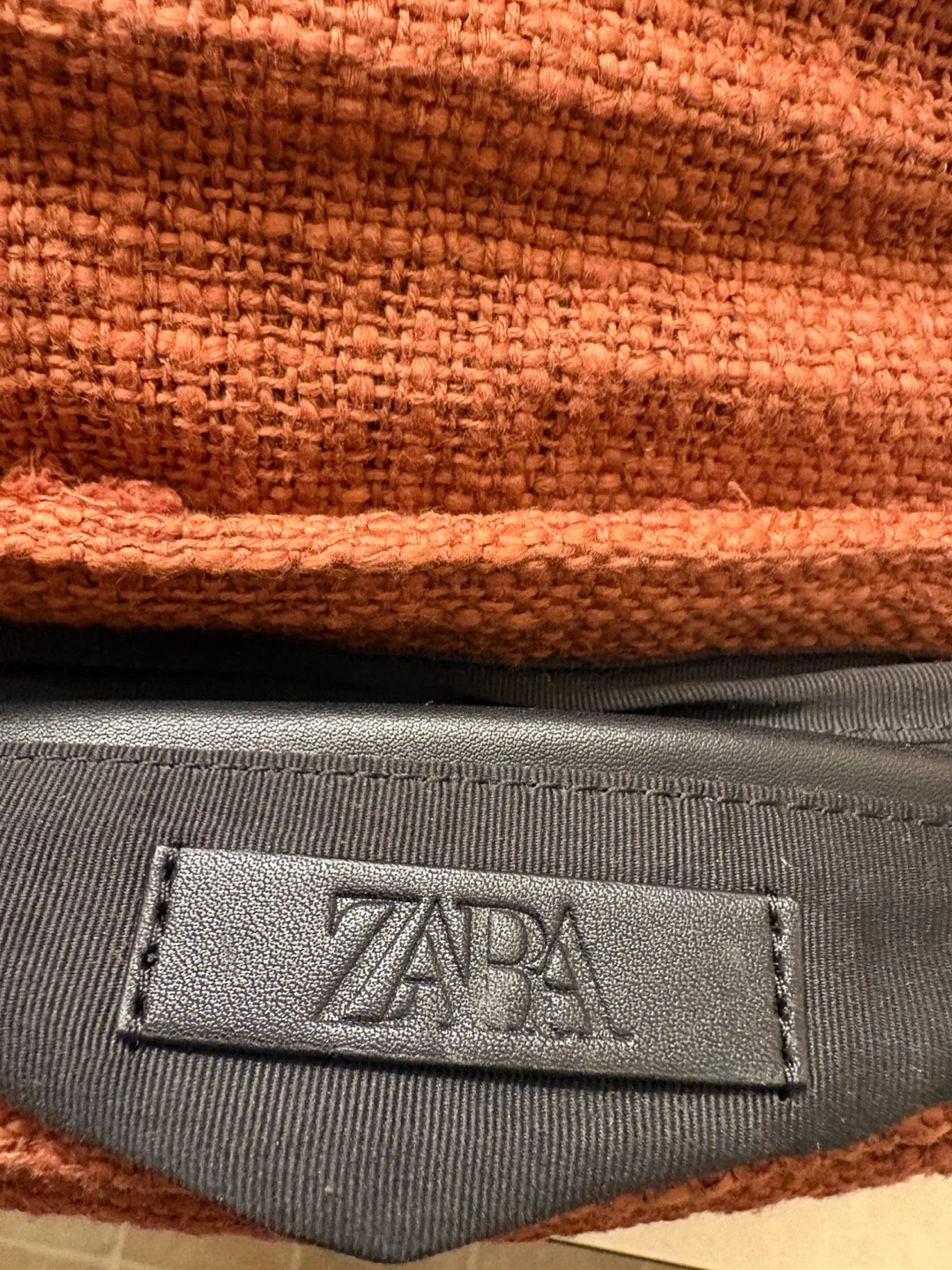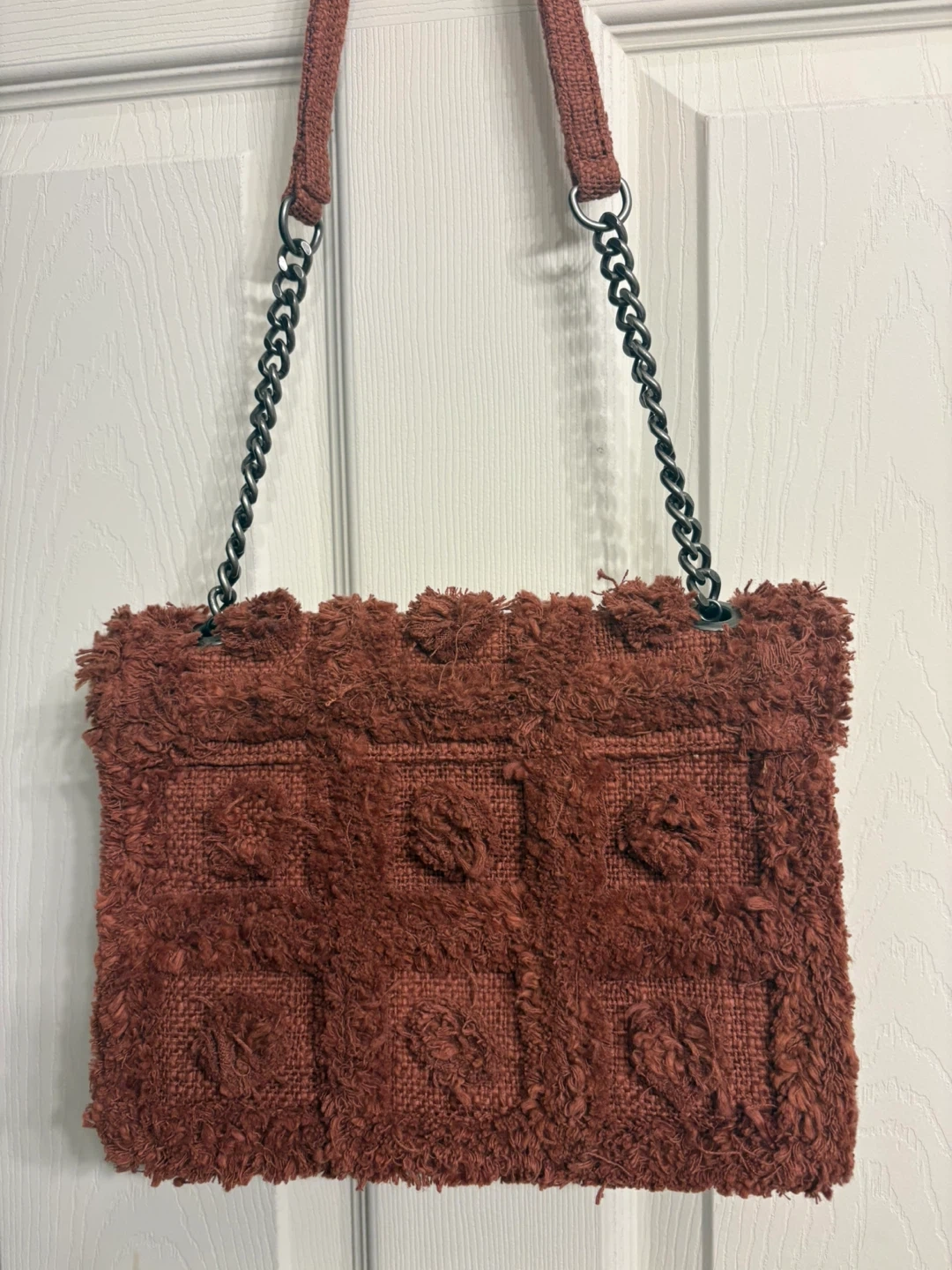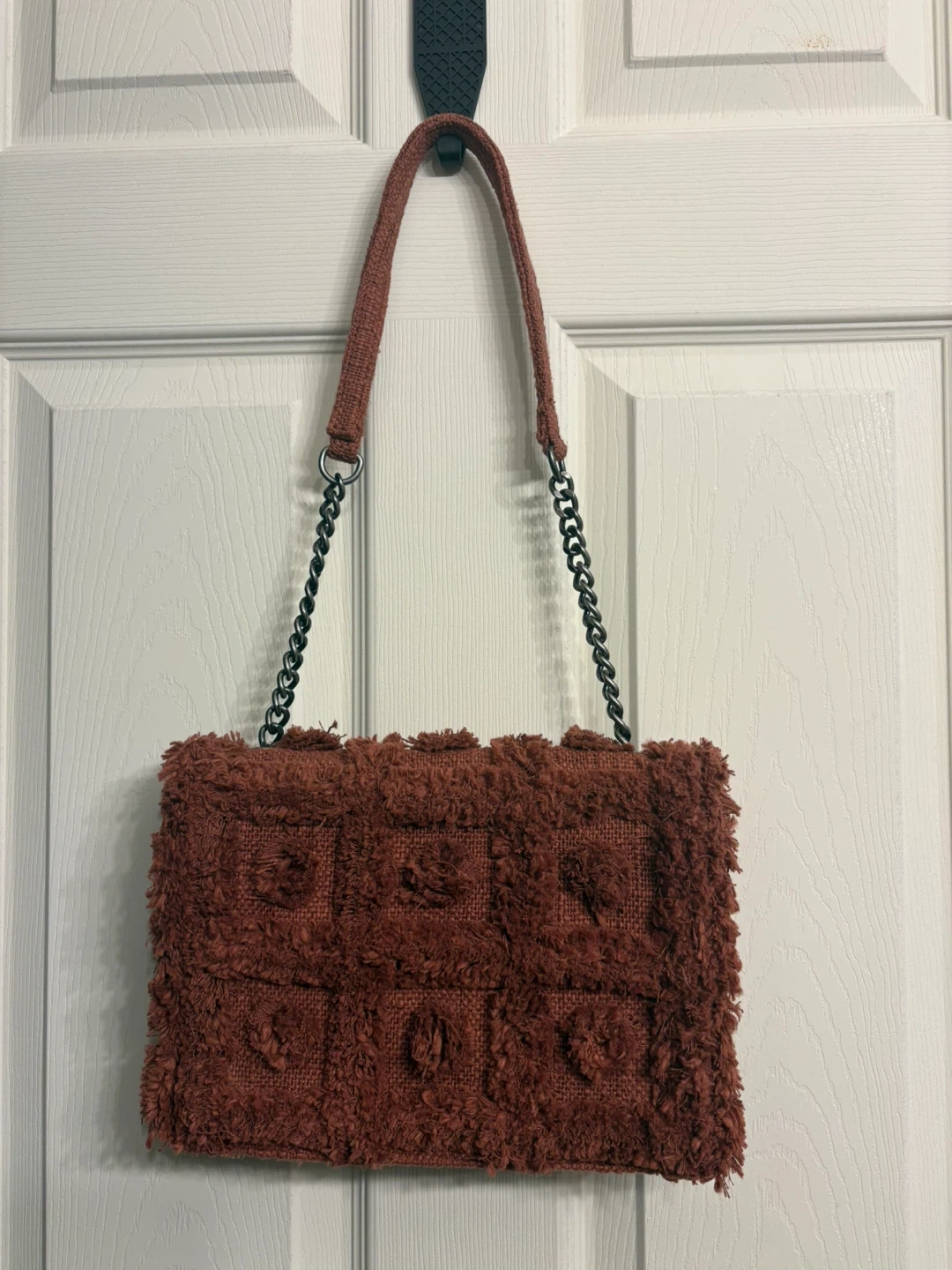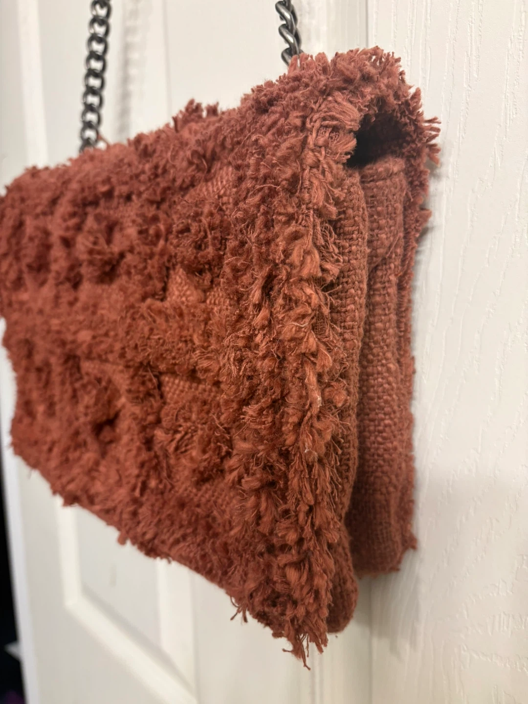 This Zara textured brown shoulder bag has a unique, fluffy exterior with a woven base. It features a secure magnetic snap closure and a stylish metal chain strap. It's roomy enough for your essentials! Perfect “like new” condition. Pick up in Chestermere.