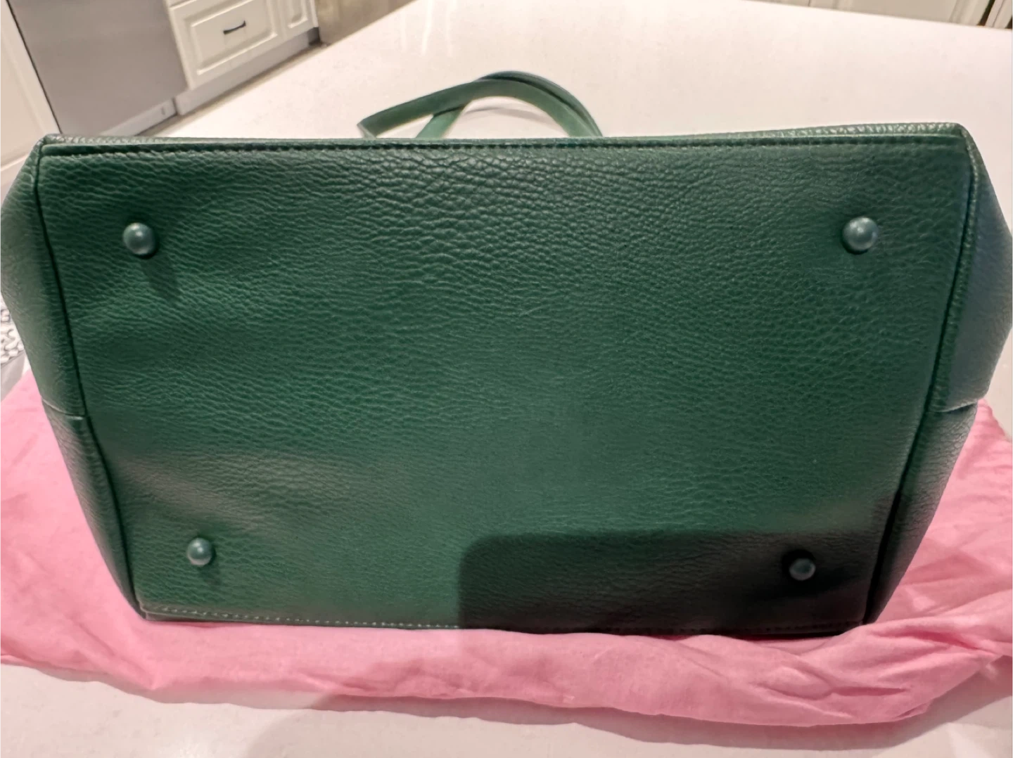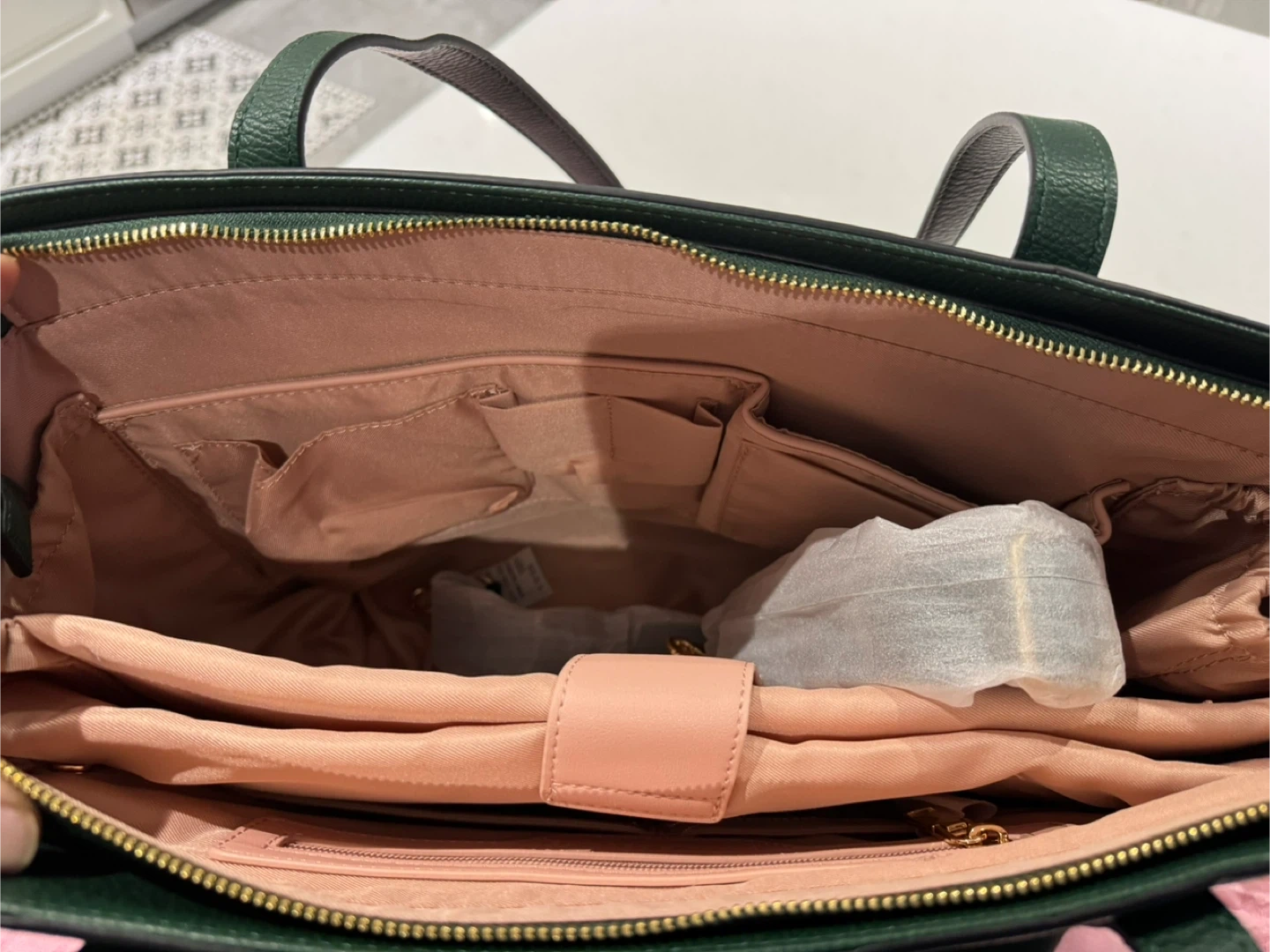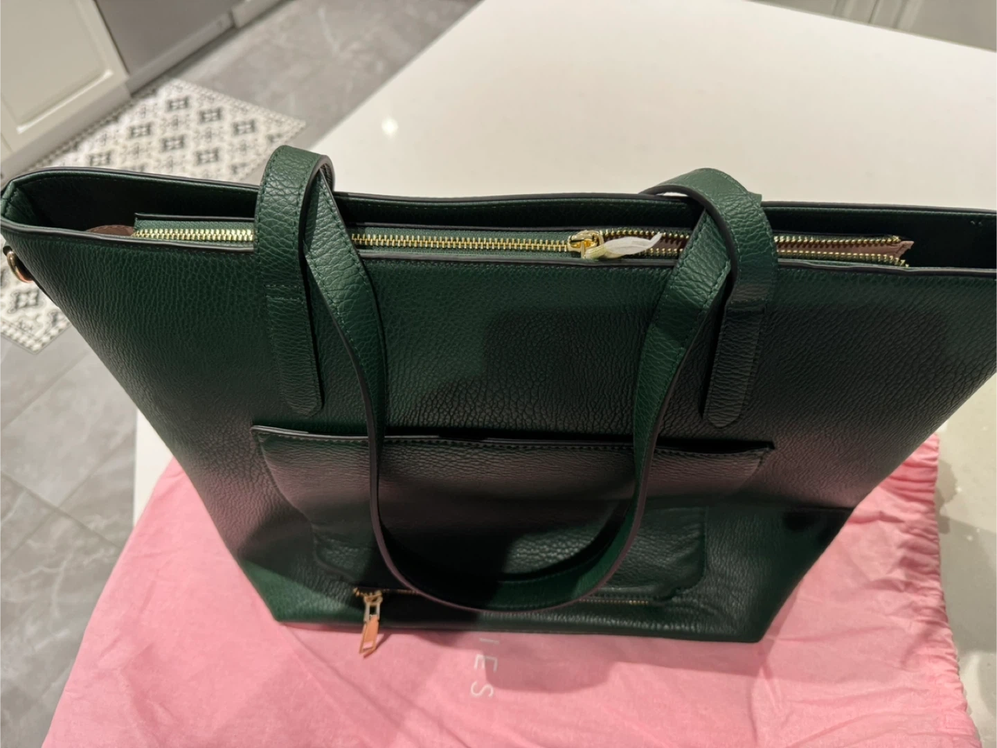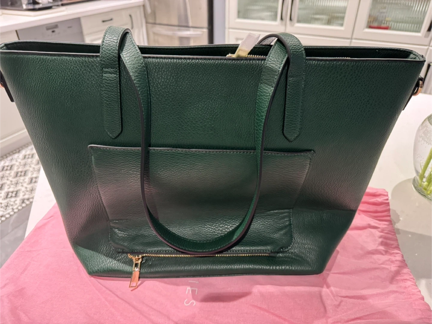 This dark green tote bag from Poppy & Peonies is a stylish and practical accessory. It features multiple interior pockets and a zippered main compartment. Comes with its original dust bag. Brand new. Just bought in February. Bag is too big for intended use.