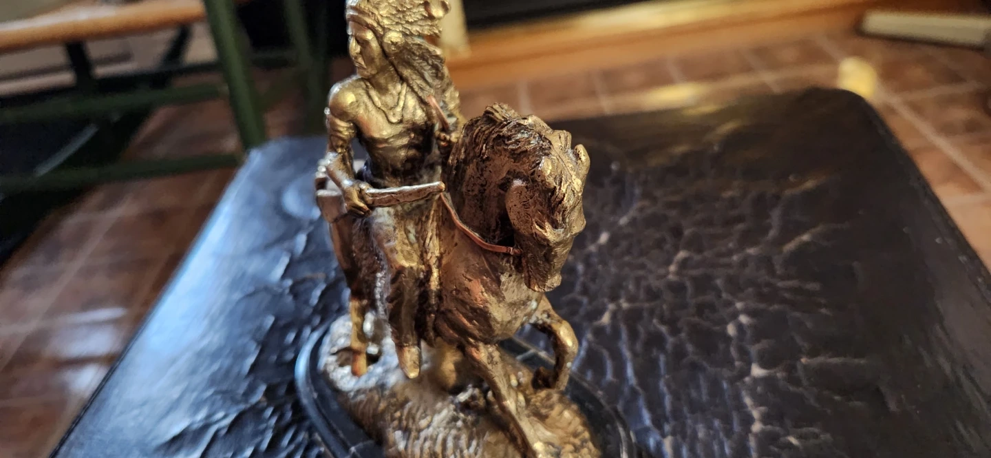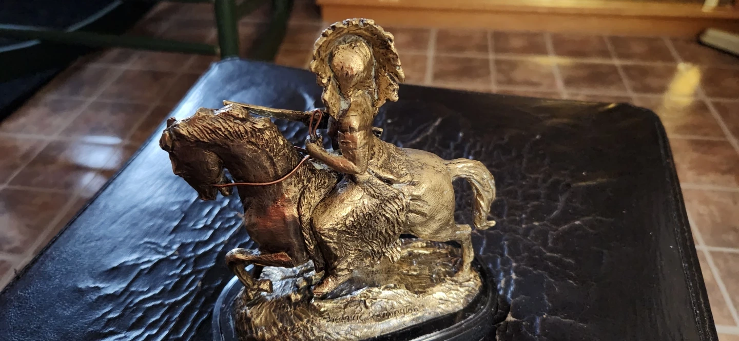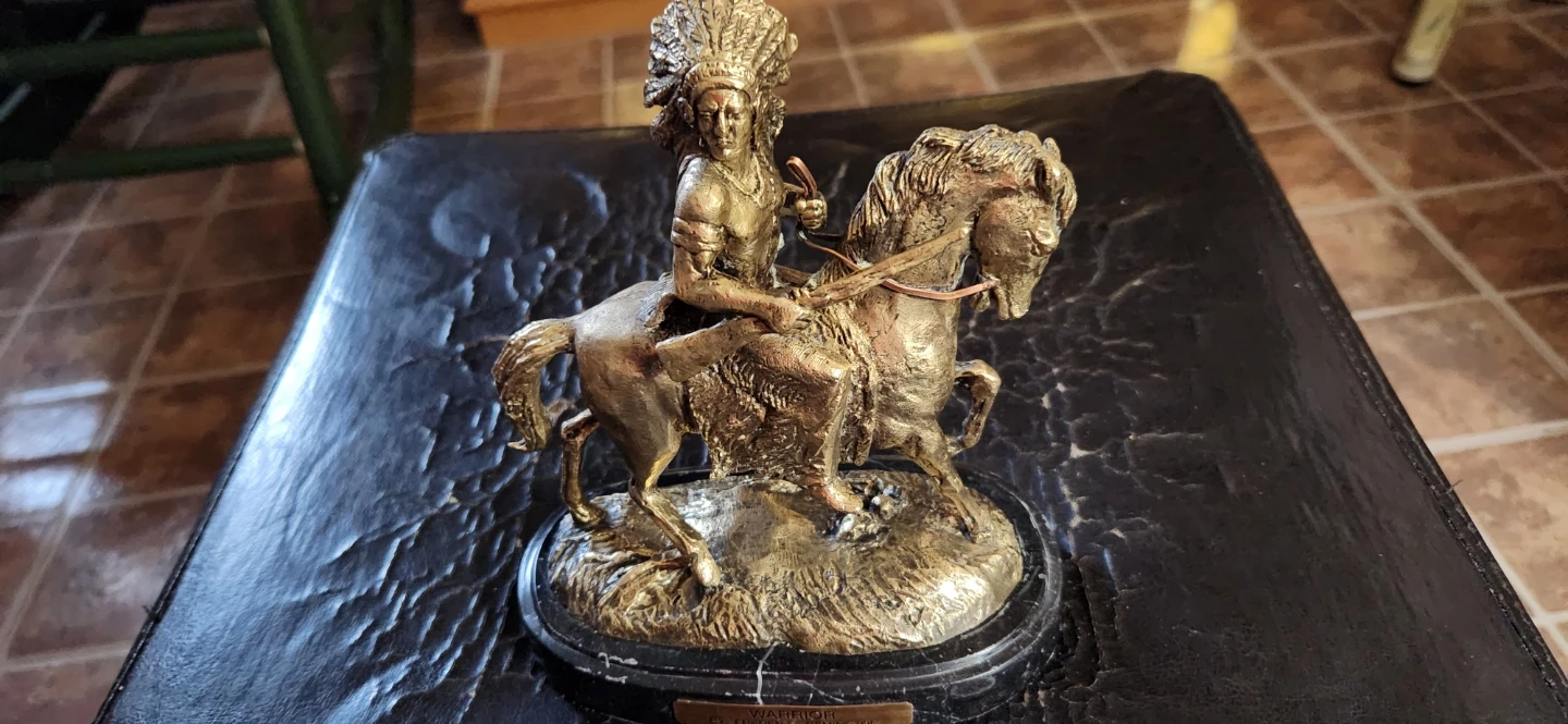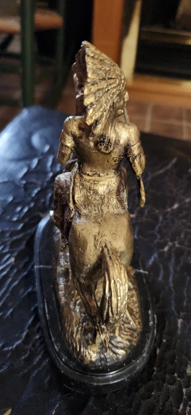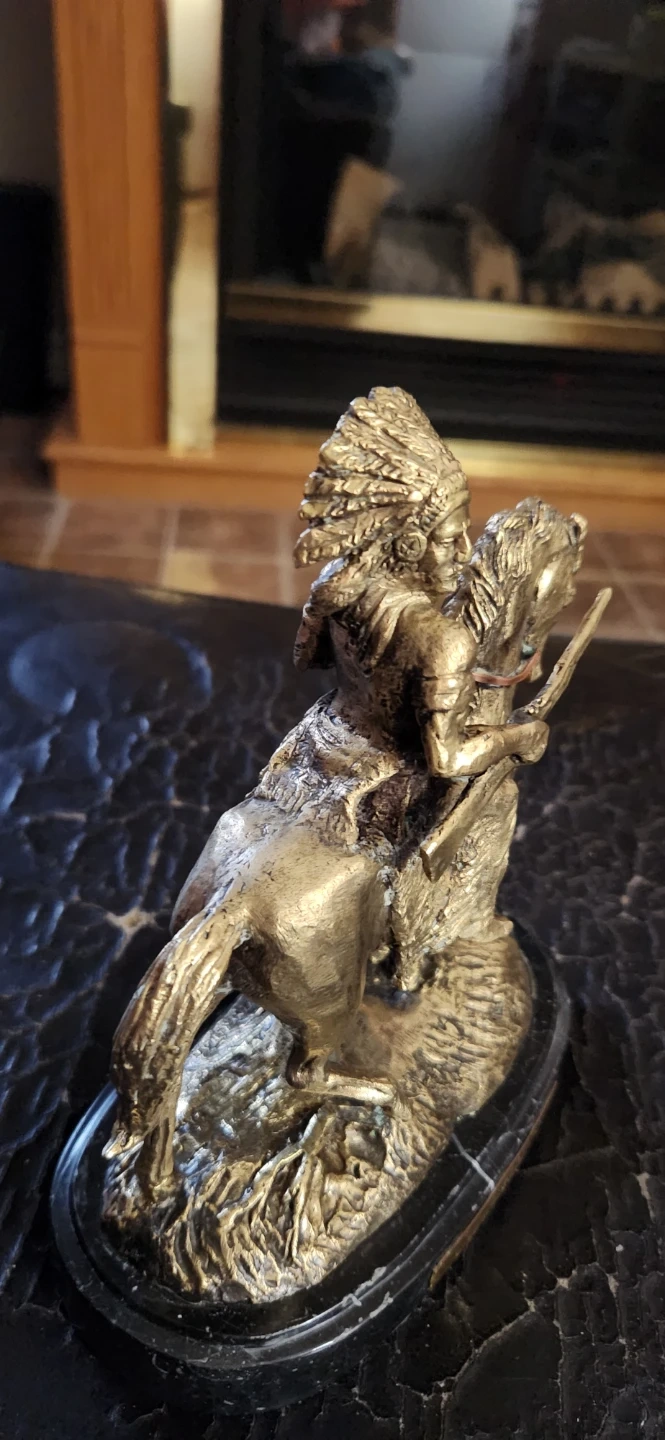 A detailed figurine depicting a Native American warrior on horseback. It's made of a metallic material, likely resin with a bronze finish. The piece has a realistic design.