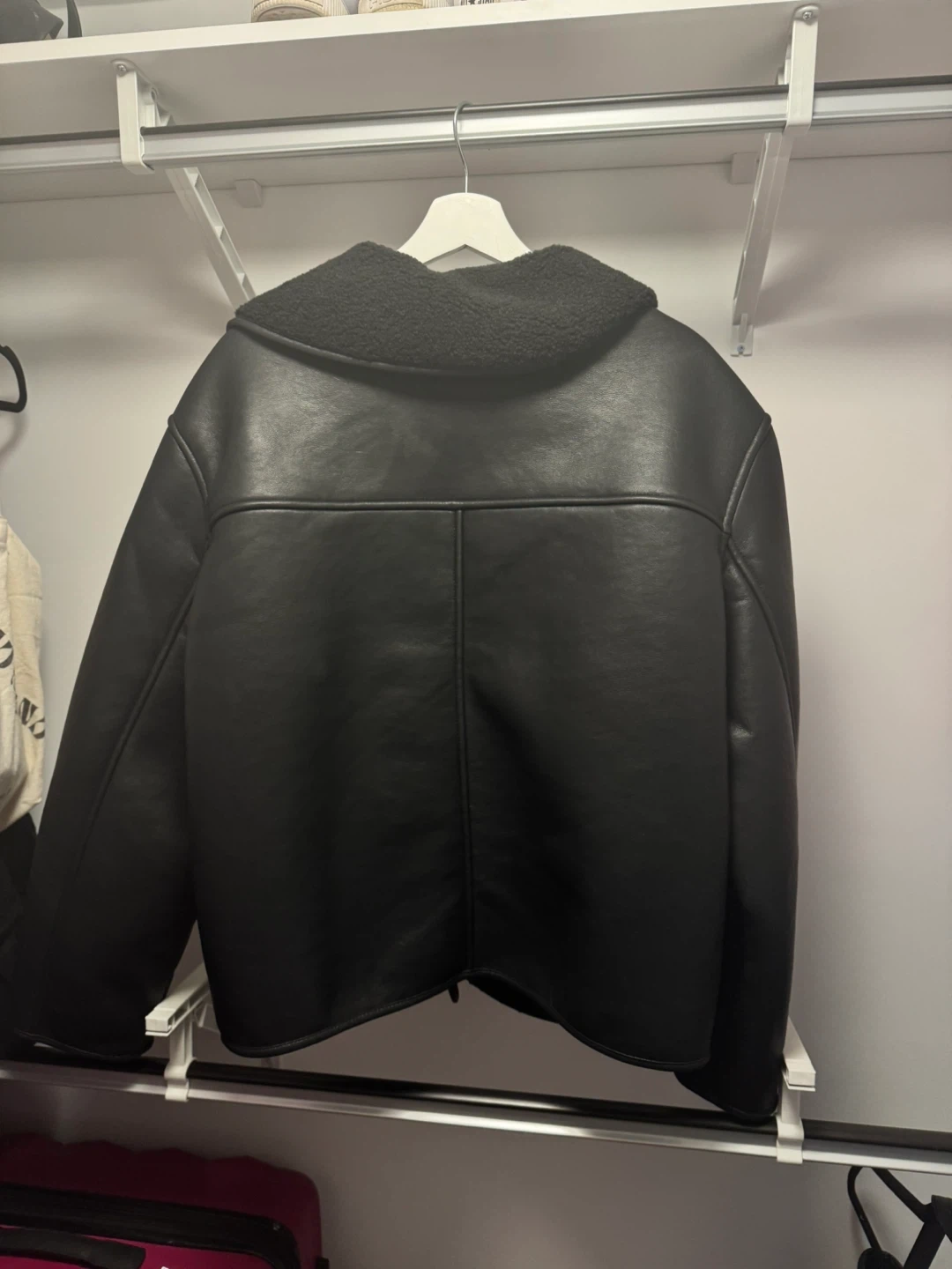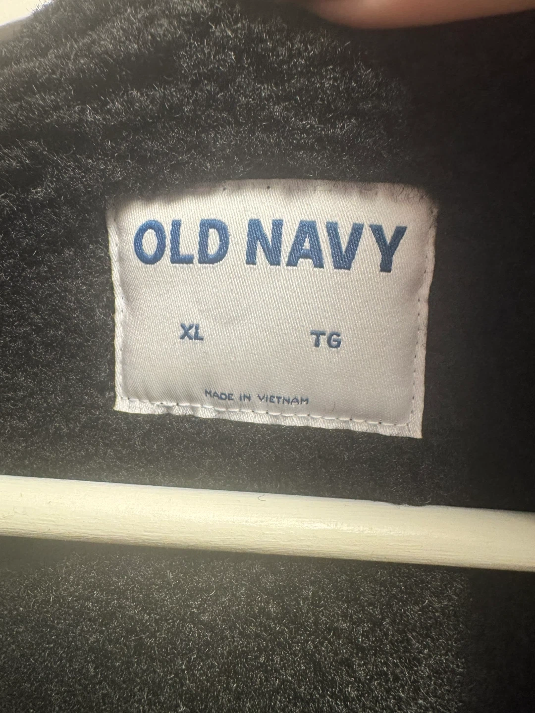 This black Old Navy jacket is faux leather with a cozy sherpa lining. It's size XL/TG. This jacket's great for staying warm on chilly days! I don’t like the fit on me, hope someone else can use it!