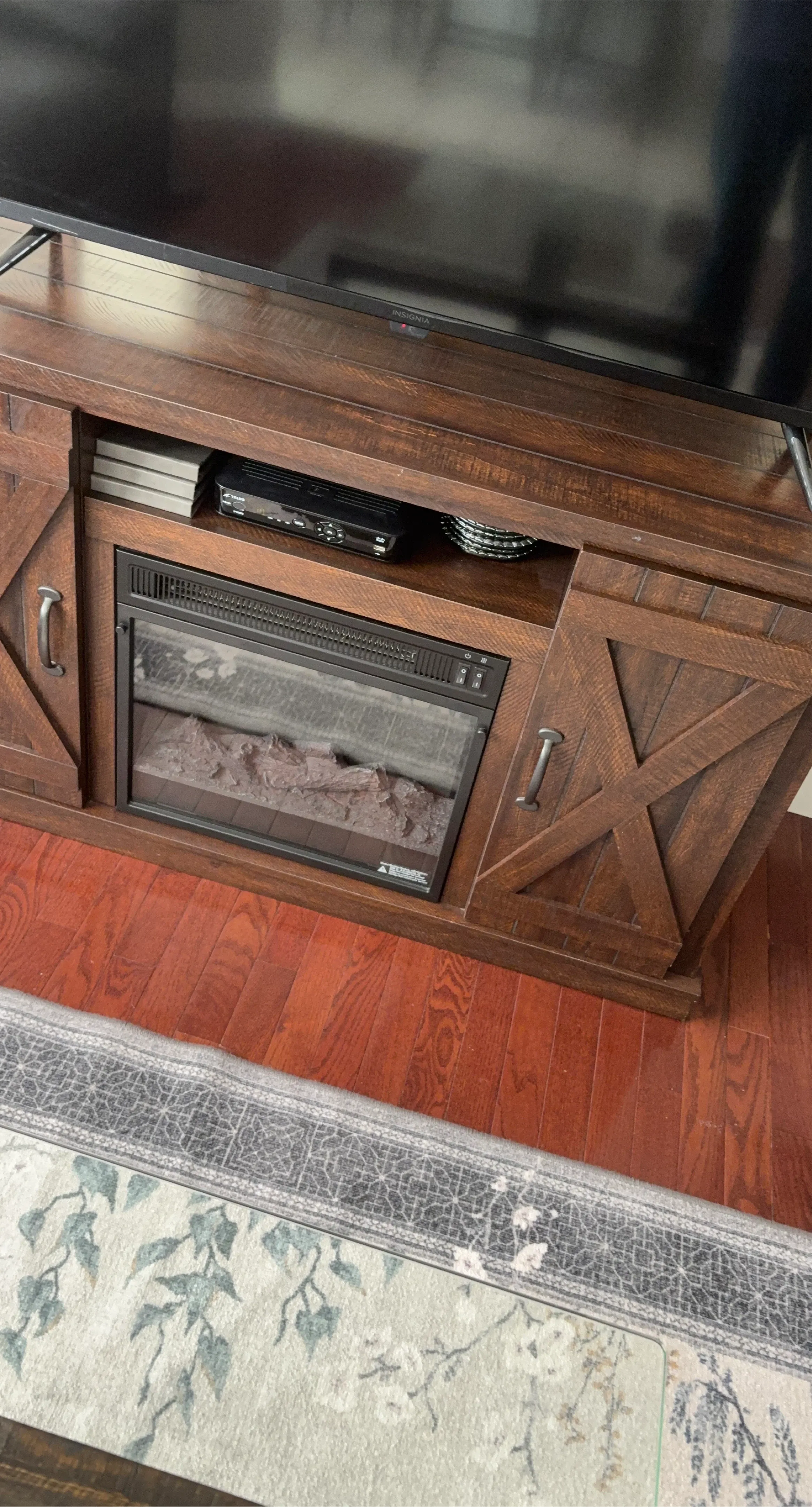 Rustic brown wooden media console featuring an integrated electric fireplace with realistic logs. It has plenty of storage space for media devices and decor. This console will add a cozy ambiance to any living room!