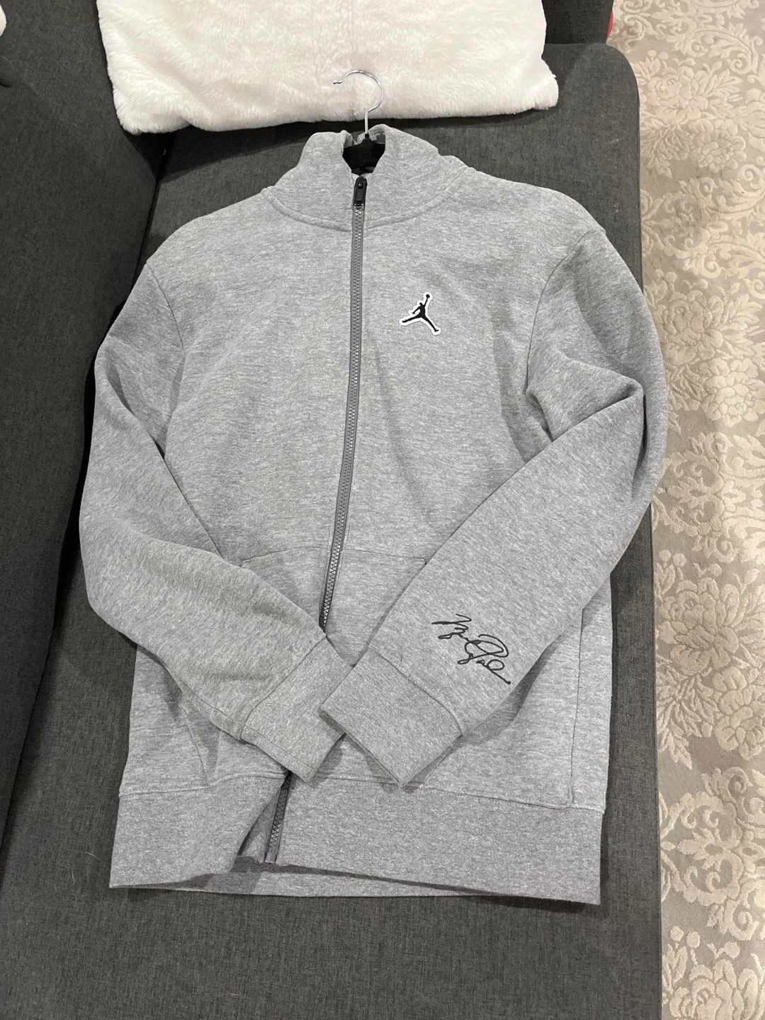 Grey full-zip track jacket from Jordan. It features the Jumpman logo on the chest and embroidered signature detail on the sleeve. Standard fit for everyday wear.