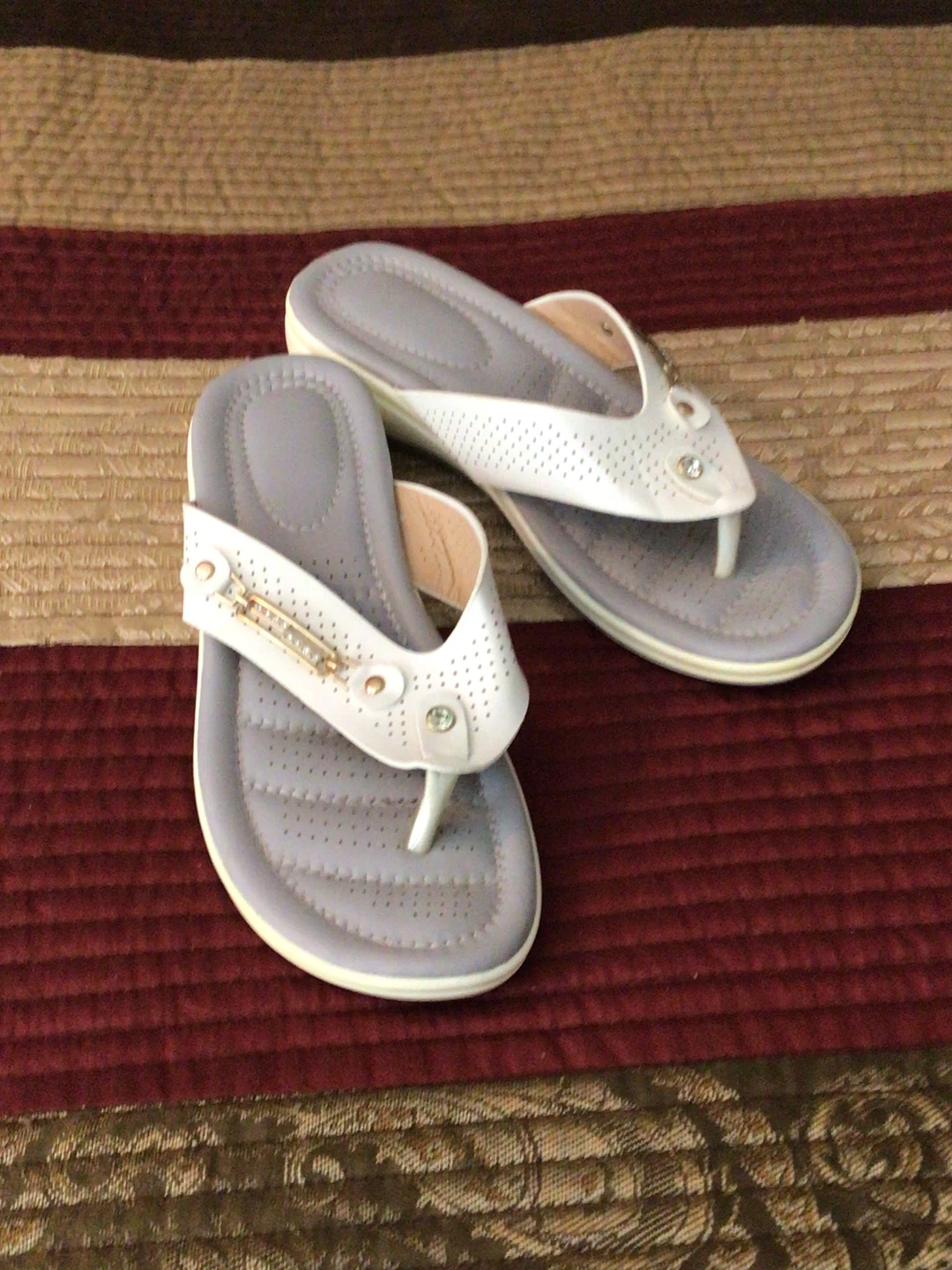 These are a pair of white flip flops. They have a decorative design on the straps. They appear to be in good condition and ready for a new owner!