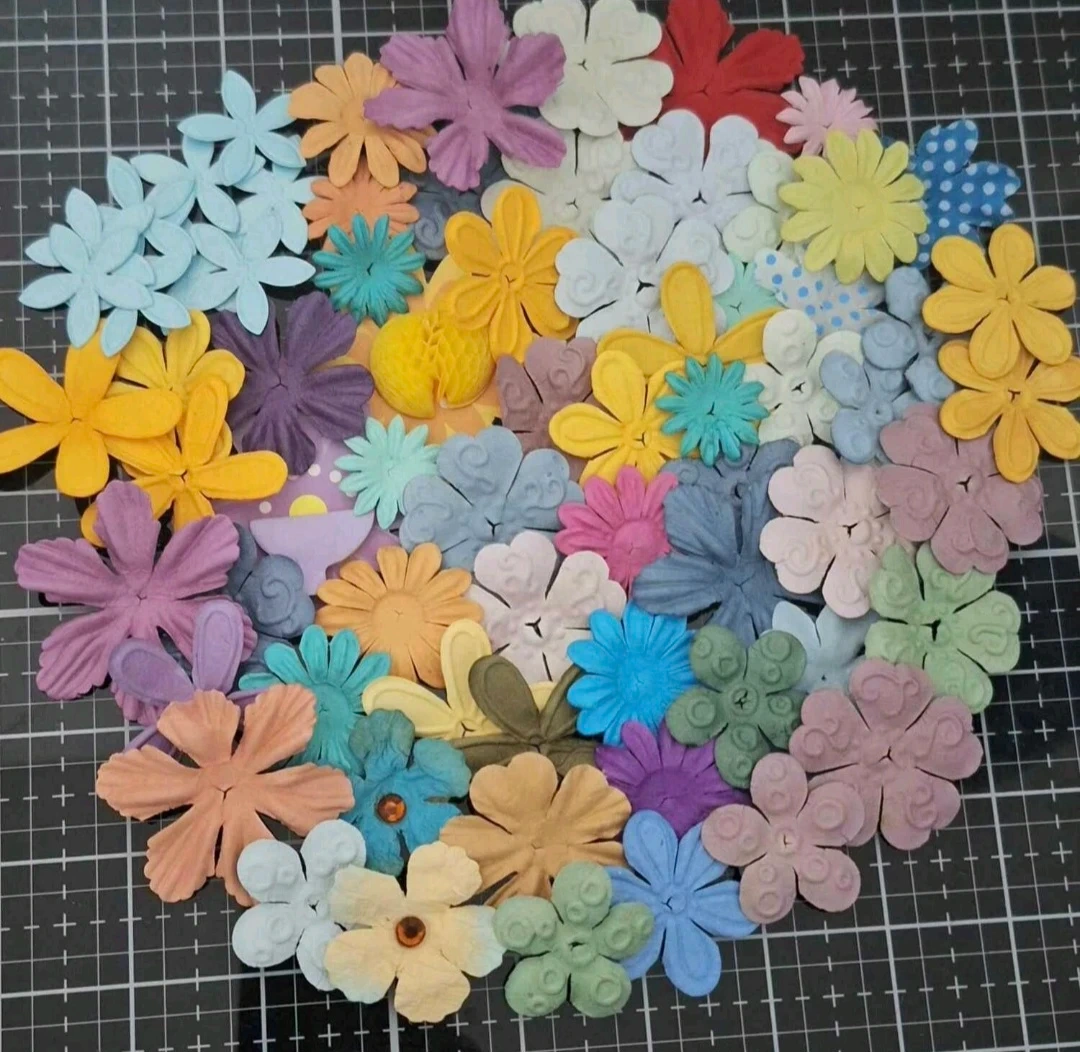 A collection of colourful paper flowers, perfect for all your crafting needs! They come in a variety of colours and styles. Great for scrapbooking, card making, or any DIY project you have in mind