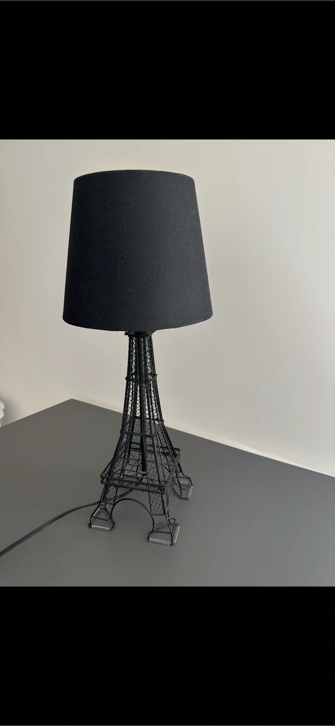 Here's a cute Eiffel Tower table lamp! It has a black lampshade and a metal Eiffel Tower base. It would look great in any room