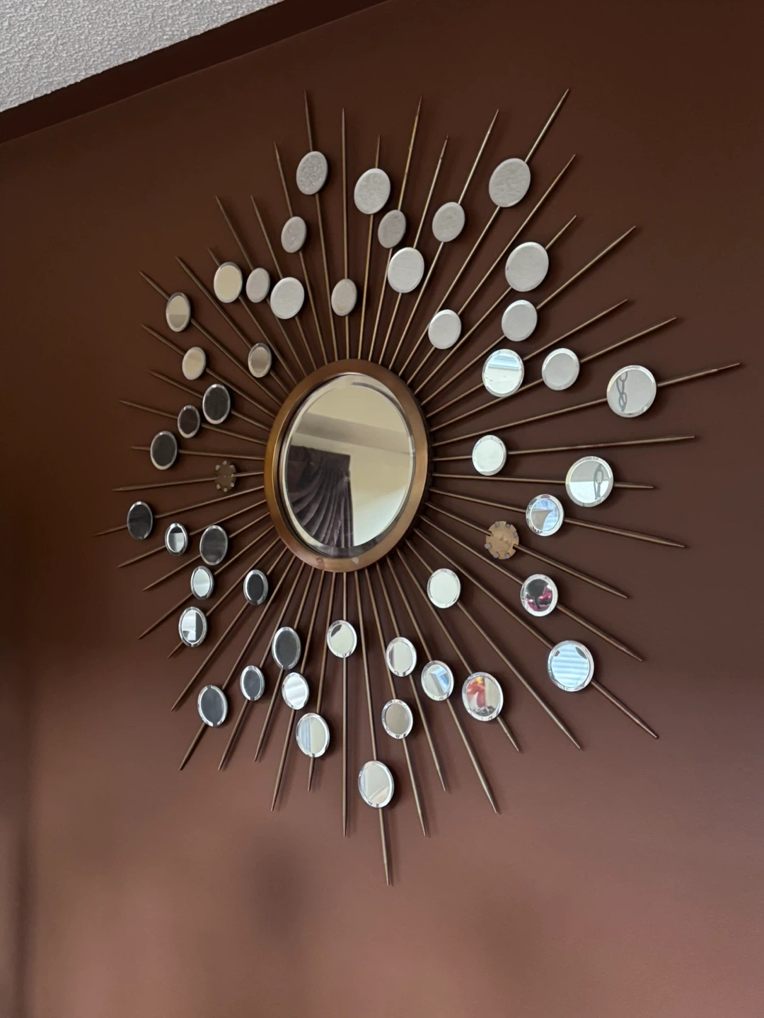 Add a touch of retro flair to your home with this eye-catching sunburst mirror! It's in great condition and ready to brighten up any room. The design features a central circular mirror surrounded by radiating spokes and smaller mirrored accents. Perfect for an entryway, living room, or bedroom!