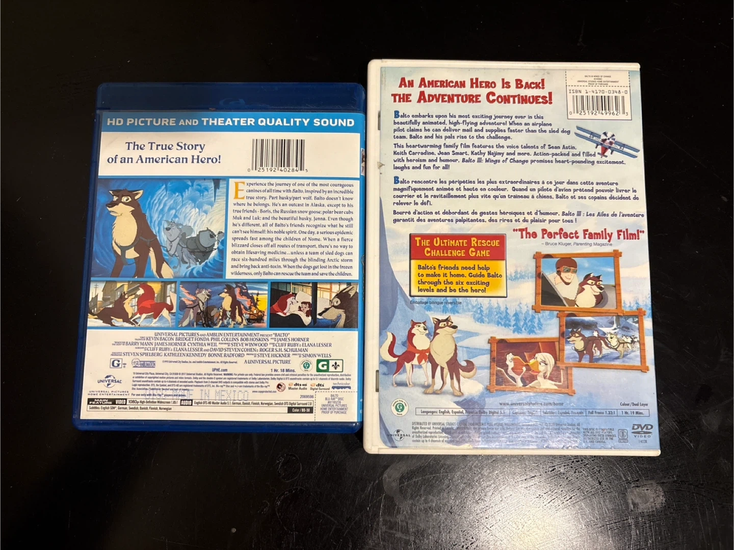 This is a Blu-ray disc for Balto and a DVD for Balto III: Wings of Change. Both films are animated adventures. They're great for family movie nights.