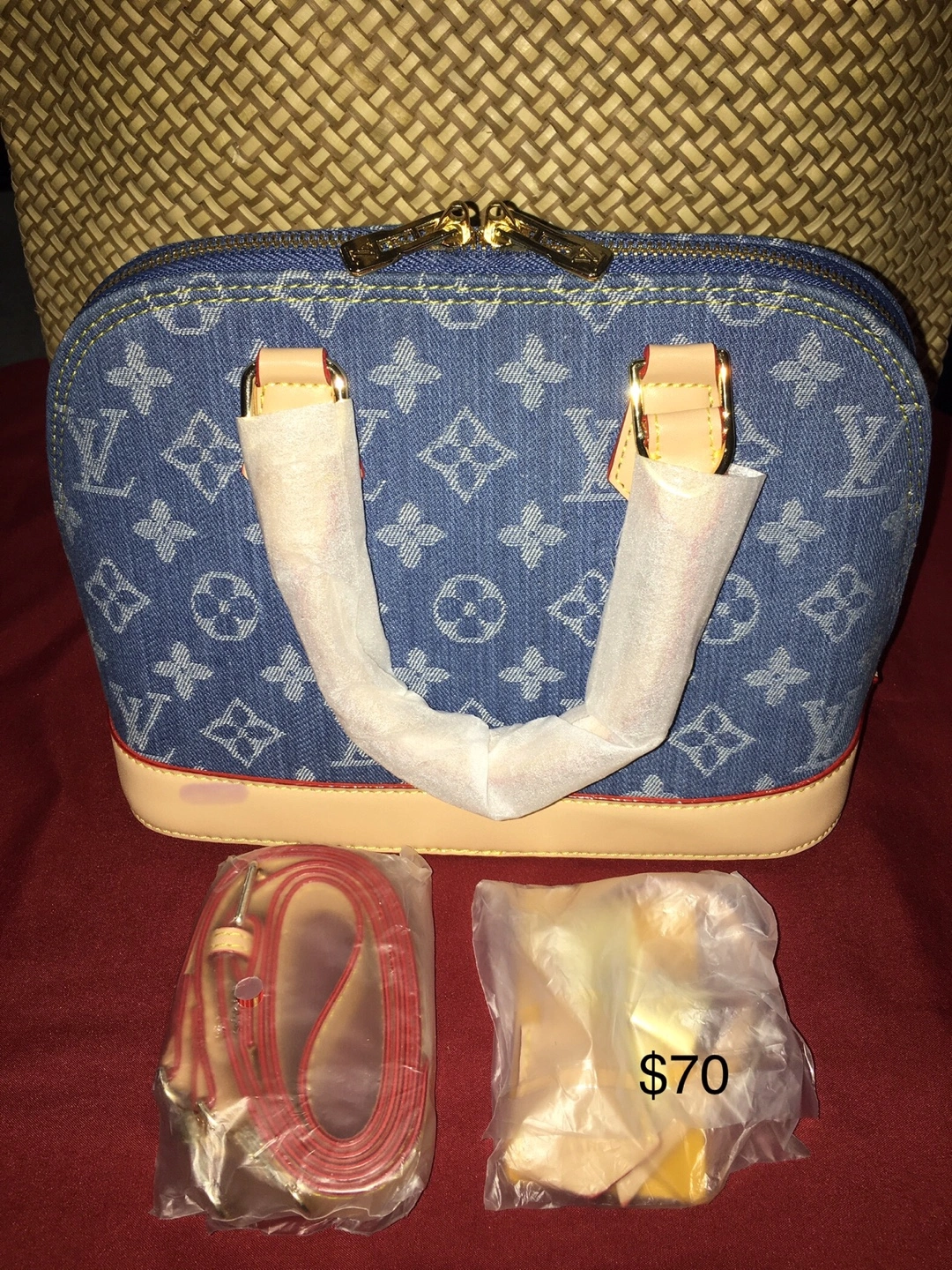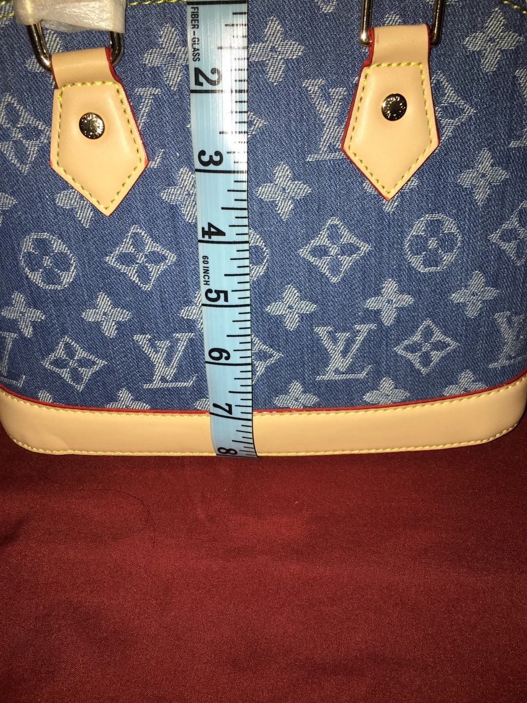 Stylish Louis Vuitton Alma BB handbag in monogram denim. It features a top zip closure and leather trim. Includes a removable strap and dust bag. Crafted with quality denim and leather accents.