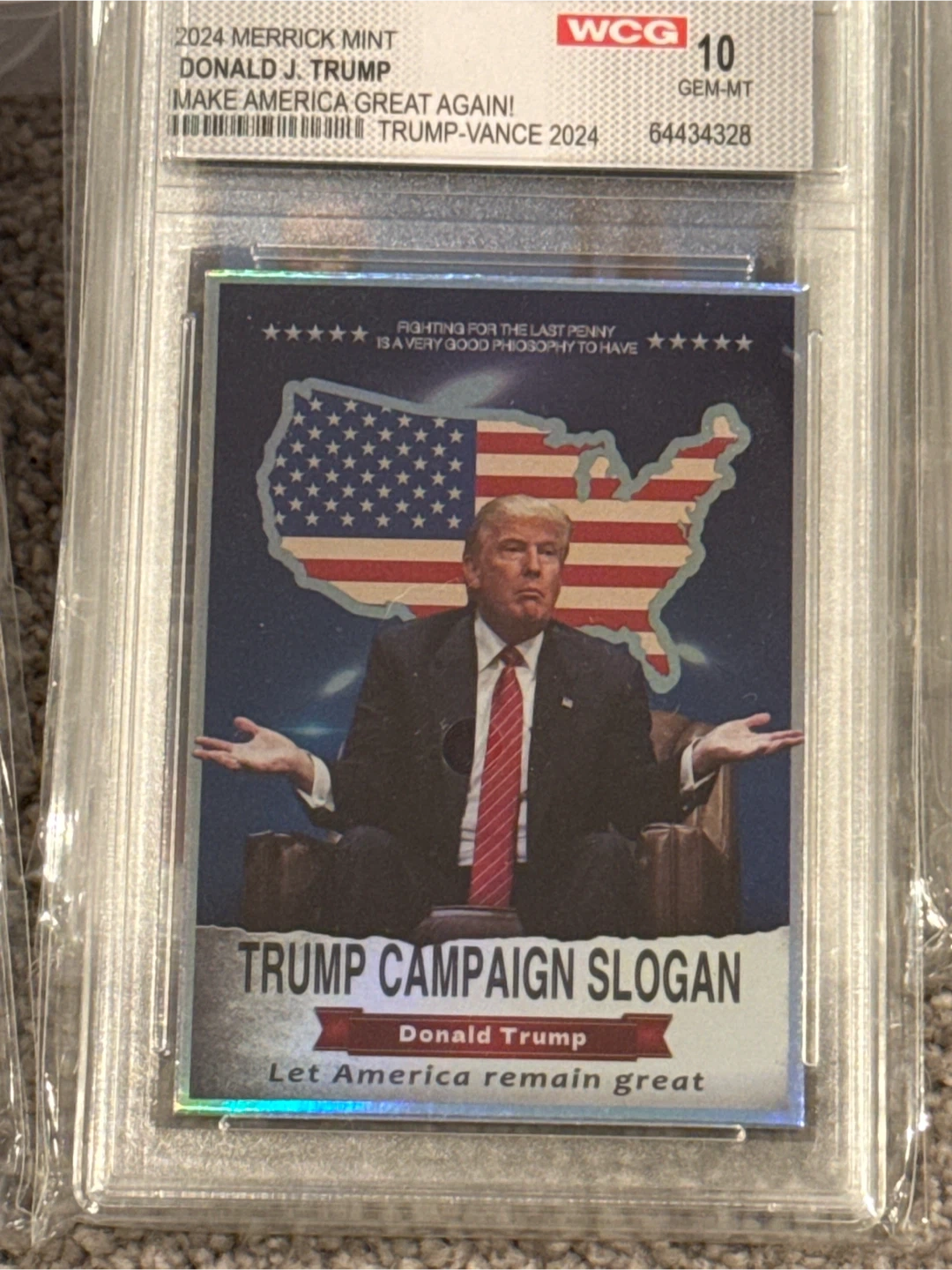 Selling a Donald J. Trump trading card from the 2024 Merrick Mint. The card features the 'Make America Great Again!' slogan and is graded WCG 10 GEM-MT. It's a unique collectible!