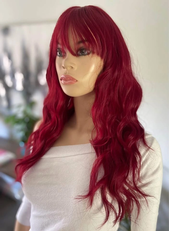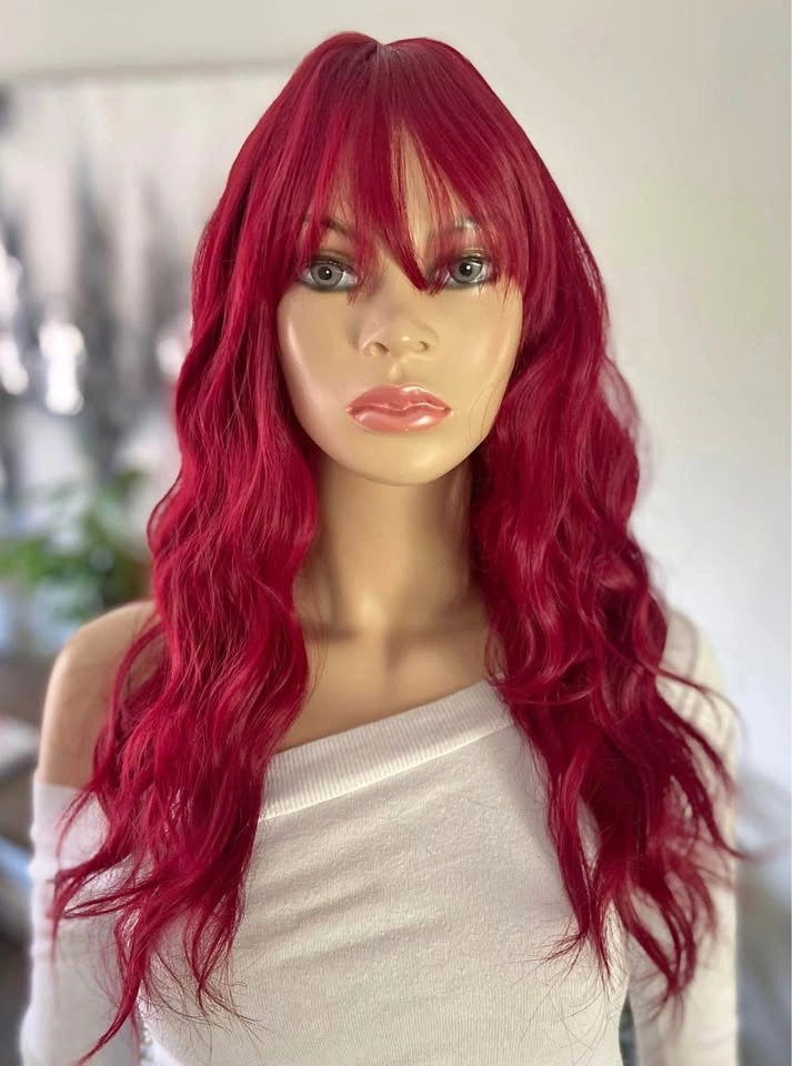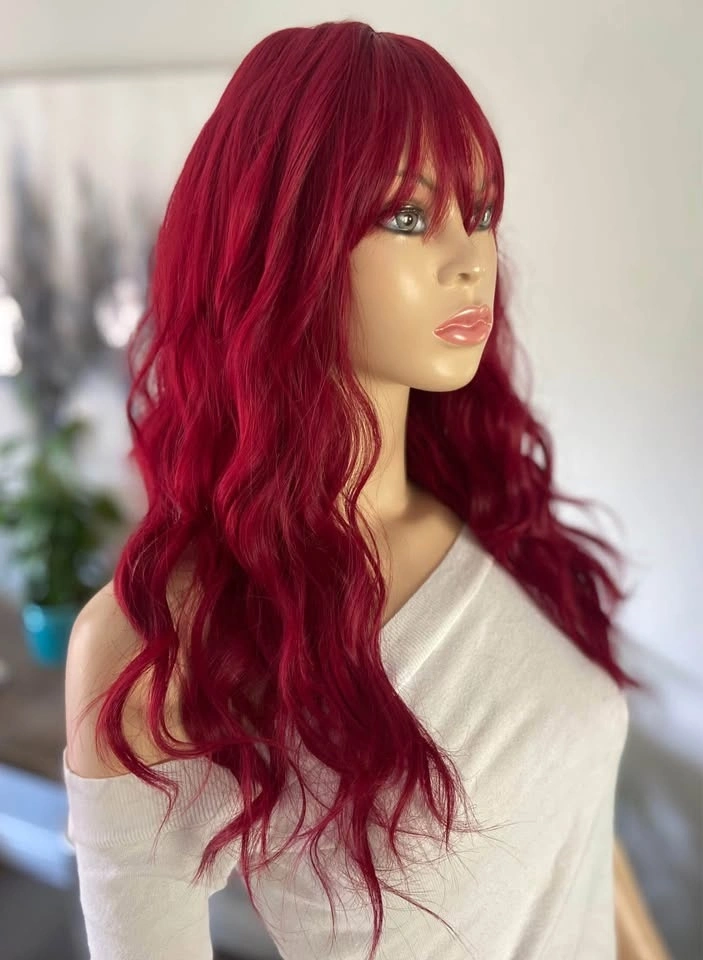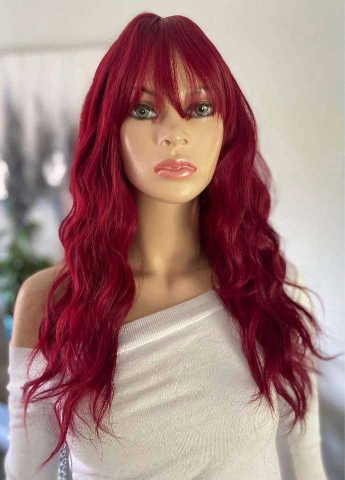 NWOT: 22-inch Long Wavy Burgundy Wine Red Synthetic Cosplay Wig w/ Bangs (2309)