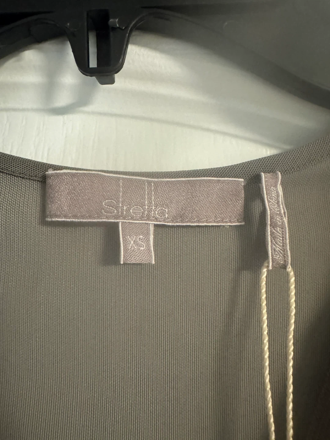 Stretta bandage mini dress in size XS. It's a taupe colour with a sleeveless design. Features a V-neckline and a bodycon fit. With tags