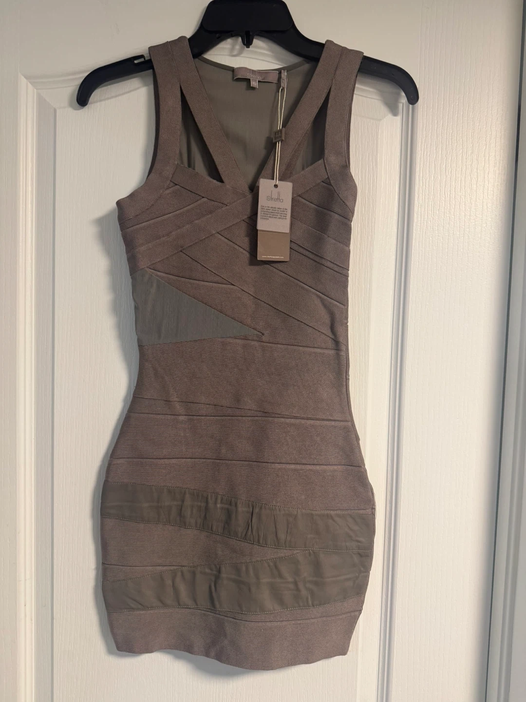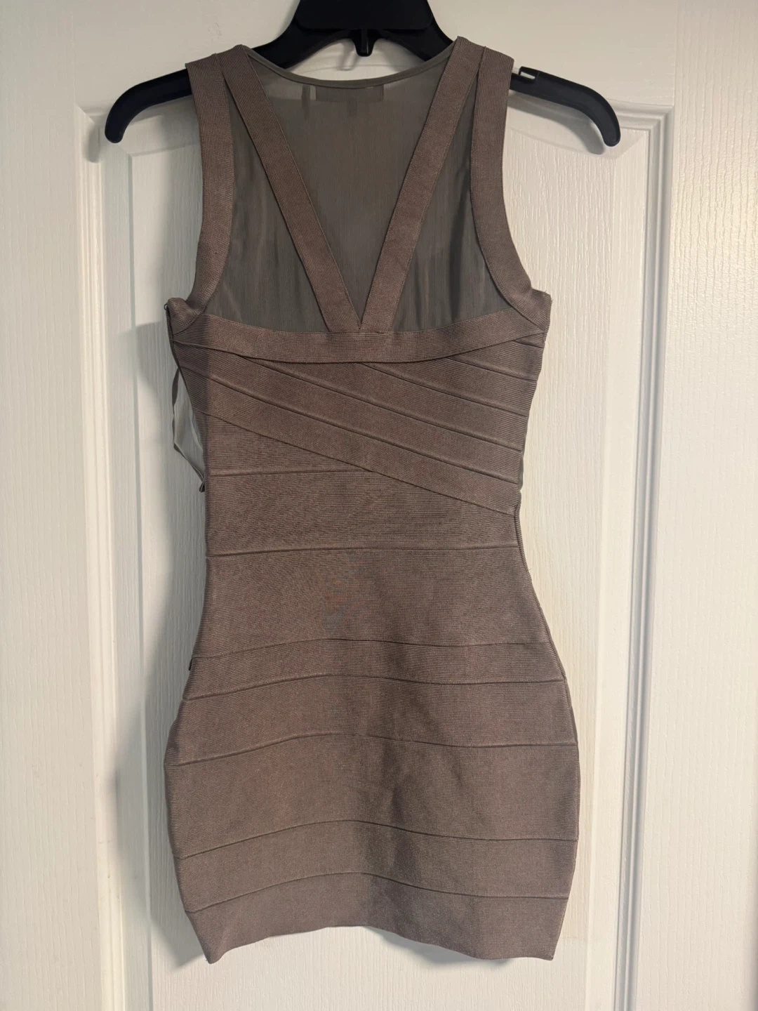 Stretta bandage mini dress in size XS. It's a taupe colour with a sleeveless design. Features a V-neckline and a bodycon fit. With tags