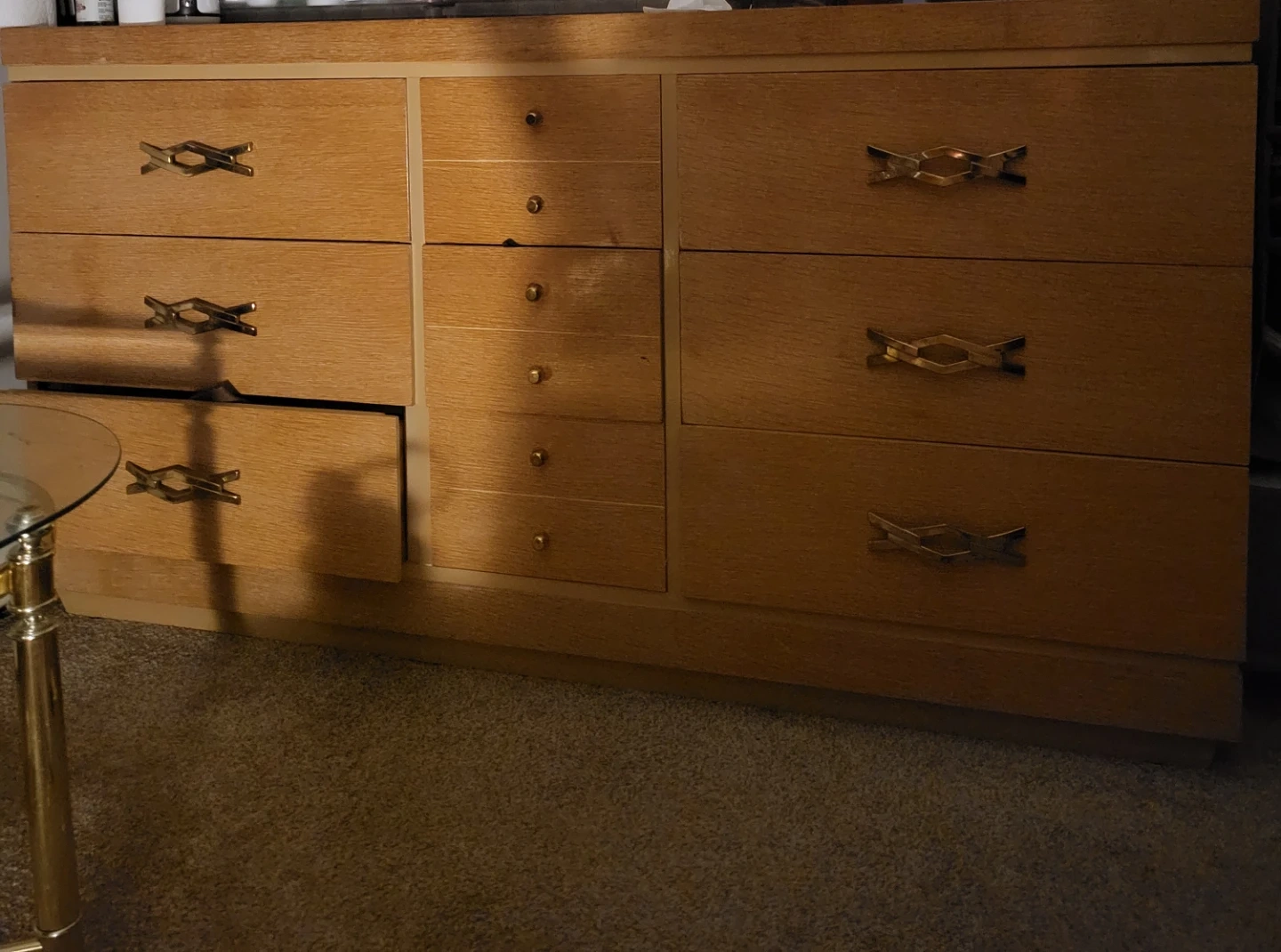 This is a lovely wooden dresser featuring nine drawers for ample storage. It has a light wood finish and unique brass-coloured drawer pulls. This dresser's classic design makes it suitable for a bedroom or living space.